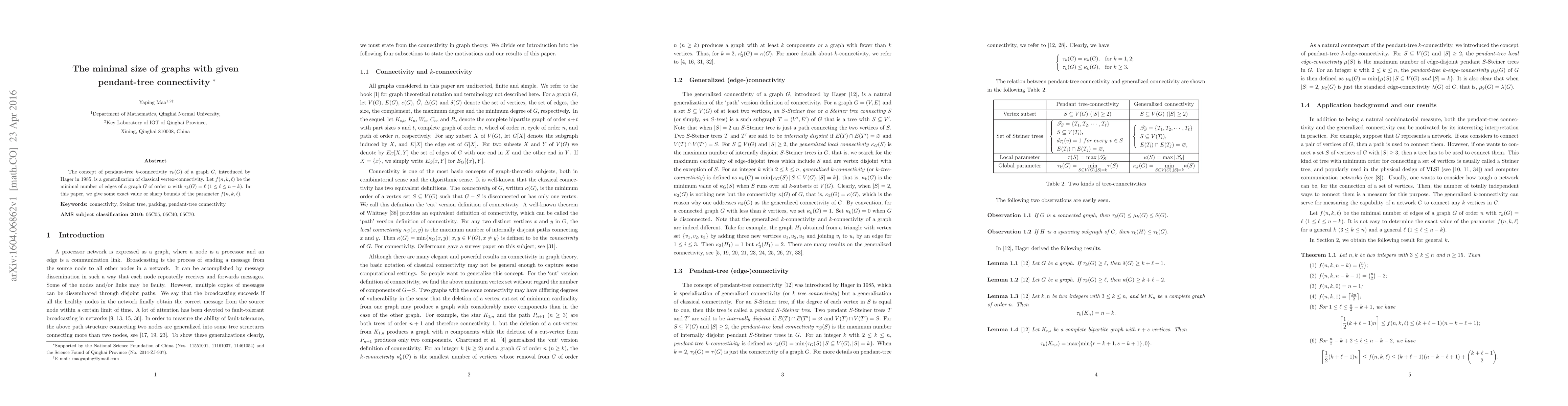 This paper investigates the minimal size of graphs with a specified pendant-tree $k$-connectivity $\tau_k(G)$, providing exact values or sharp bounds for the function $f(n,k,\ell)$ that represents the smallest number of edges in such graphs with order $n$.