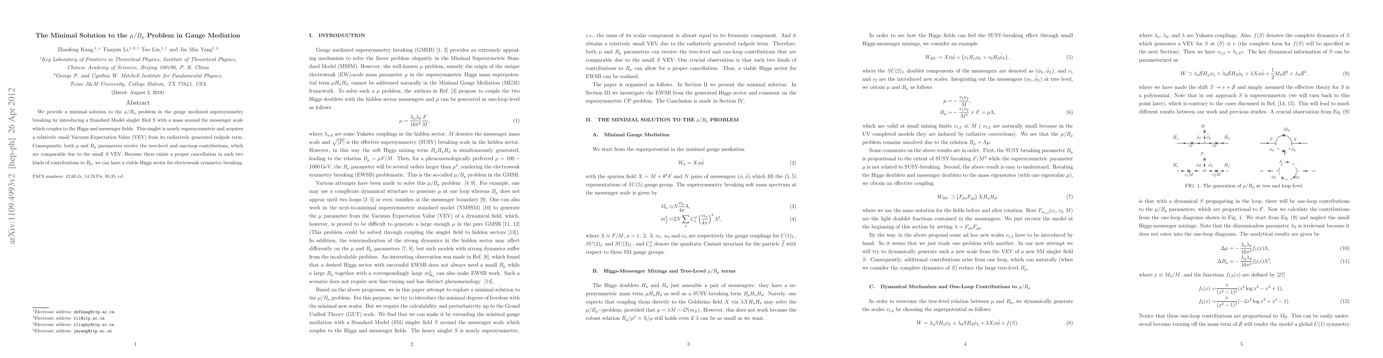This paper proposes a minimal solution to the mu/B_mu problem in gauge mediation by introducing a nearly supersymmetric singlet field S, which acquires a small VEV from radiative corrections. This leads to comparable tree-level and one-loop contributions to mu and B_mu, allowing for a viable Higgs sector for electroweak symmetry breaking.