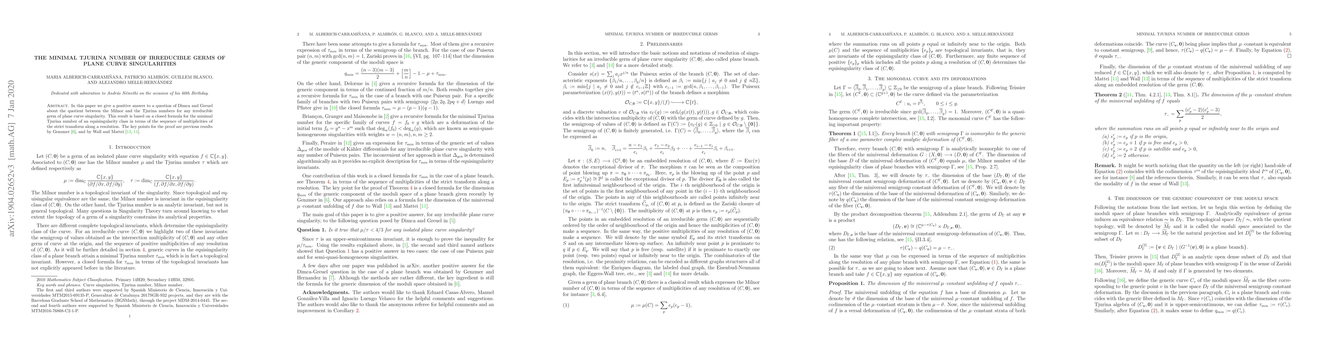 In this paper we give a positive answer to a question of Dimca and Greuel about the quotient between the Milnor and the Tjurina numbers for any irreducible germ of plane curve singularity. This result is based on a closed formula for the minimal Tjurina number of an equisingularity class in terms of the sequence of multiplicities of the strict transform along a resolution. The key points for the proof are previous results by Genzmer, Wall and Mattei.