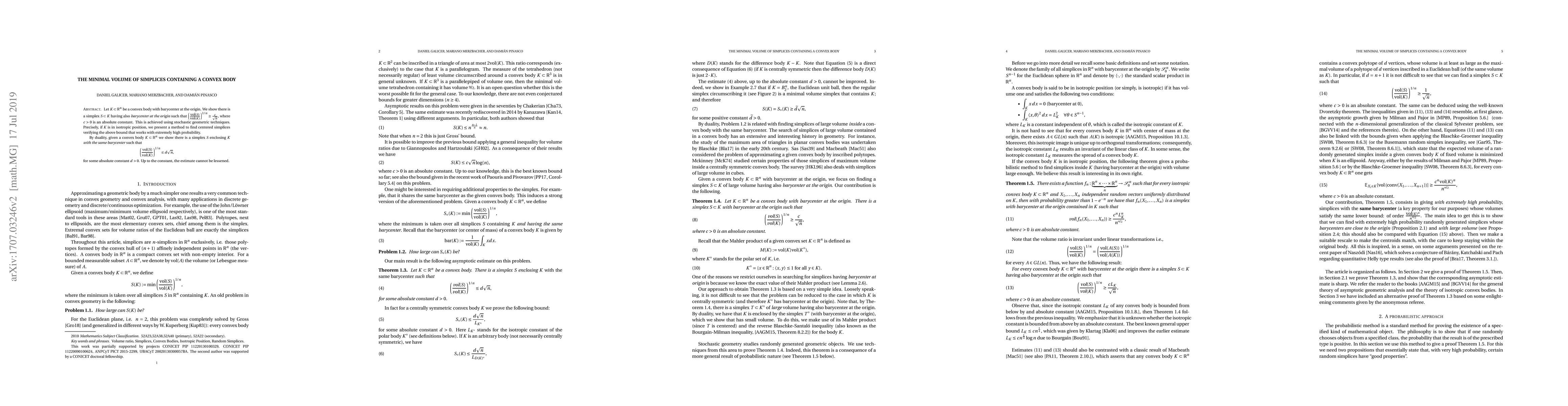 This paper demonstrates the existence of a simplex within a convex body $K$ that maintains the body's barycenter and has a volume ratio satisfying $\left(\frac{vol(S)}{vol(K)}\right)^{1/n} \geq \frac{c}{\sqrt{n}}$, using stochastic geometric techniques. It also provides an asymptotic estimate for the minimal volume simplex enclosing $K$, showing $\left(\frac{vol(S_{min}(K))}{vol(K)}\right)^{1/n} \leq d \sqrt{n}$.
