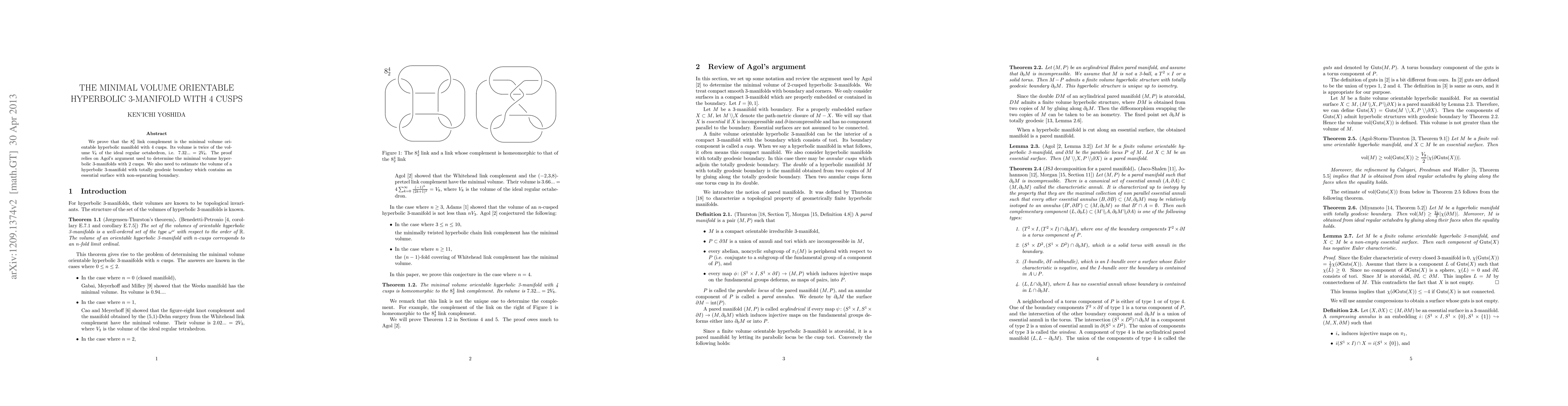 This paper proves that the 8^4_2 link complement is the smallest volume orientable hyperbolic 3-manifold with four cusps, having a volume of twice the volume of the ideal regular octahedron, specifically 7.32. The proof utilizes Agol's method for minimal volume manifolds and involves estimating volumes of hyperbolic 3-manifolds with non-separating boundaries.