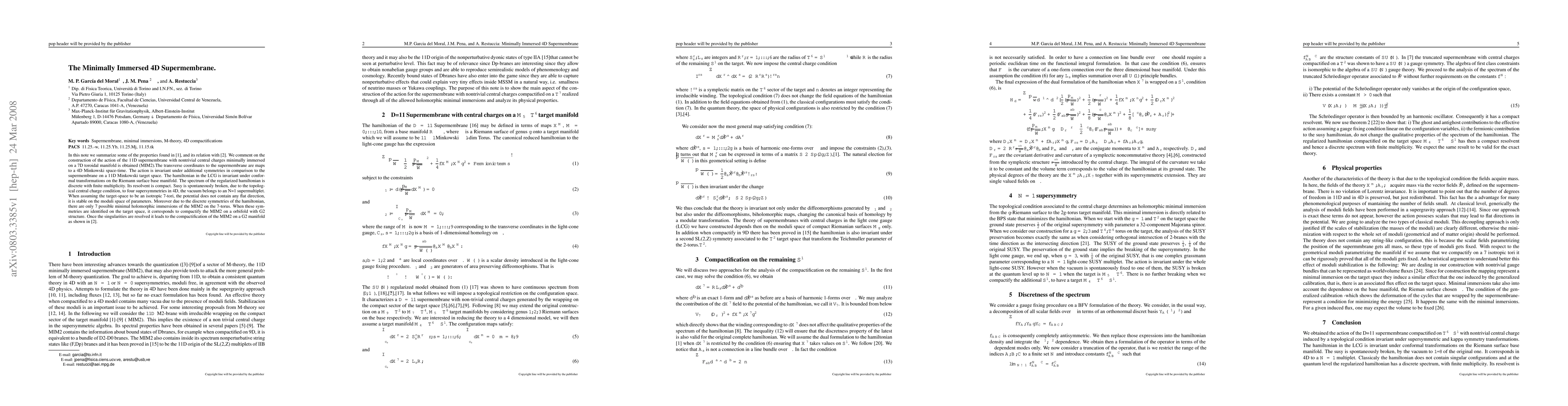 In this note we summarize some of the properties found in [1], and its relation with [2]. We comment on the construction of the action of the 11D supermembrane with nontrivial central charges minimally immersed on a 7D toroidal manifold is obtained (MIM2).The transverse coordinates to the supermembrane are maps to a 4D Minkowski space-time. The action is invariant under additional symmetries in comparison to the supermembrane on a 11D Minkowski target space. The hamiltonian in the LCG is invariant under conformal transformations on the Riemann surface base manifold. The spectrum of the regularized hamiltonian is discrete with finite multiplicity. Its resolvent is compact. Susy is spontaneously broken, due to the topological central charge condition, to four supersymmetries in 4D, the vacuum belongs to an N=1 supermultiplet. When assuming the target-space to be an isotropic 7-tori, the potential does not contain any flat direction, it is stable on the moduli space of parameters. Moreover due to the discrete symmetries of the hamiltonian, there are only 7 possible minimal holomorphic immersions of the MIM2 on the 7-torus. When these symmetries are identified on the target space, it corresponds to compactify the MIM2 on a orbifold with G2 structure. Once the singularities are resolved it leads to the compactification of the MIM2 on a G2 manifold as shown in [2].