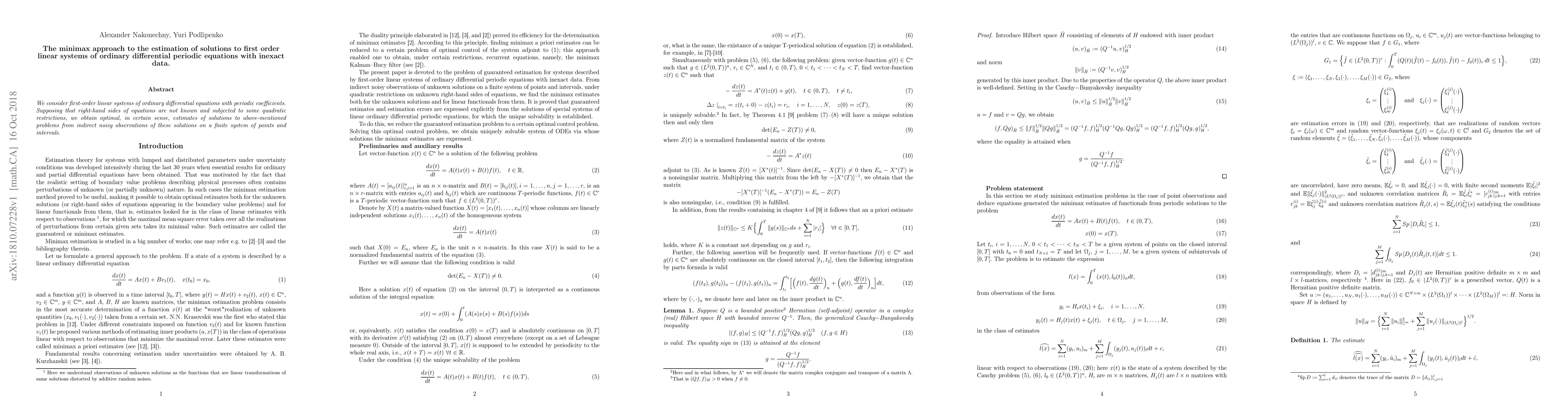 This paper explores the minimax approach for estimating solutions to first-order linear periodic differential equations with uncertain data, providing optimal estimates based on noisy observations through indirect measurements.