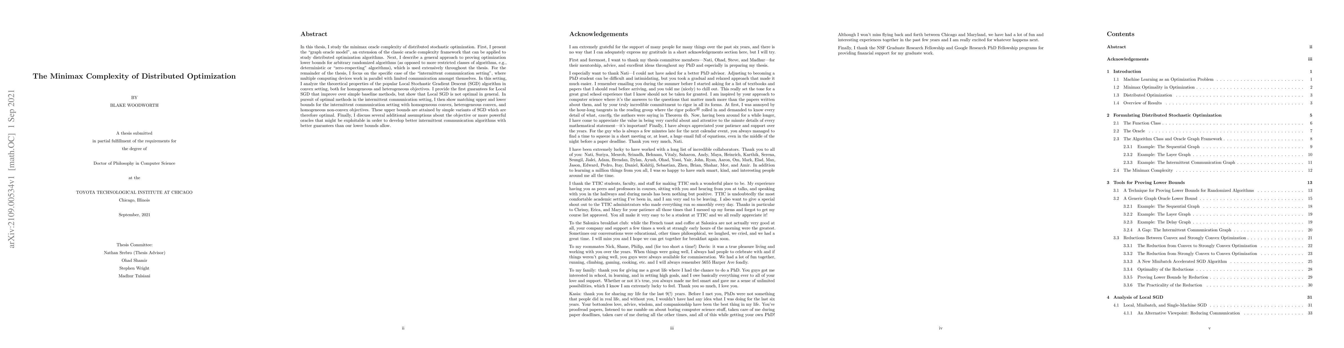 This thesis studies the minimax complexity of distributed optimization, providing lower bounds for randomized algorithms in intermittent communication settings and matching upper and lower bounds for various objectives. It establishes a general approach to proving optimization lower bounds and proposes variants of SGD that achieve optimal guarantees.