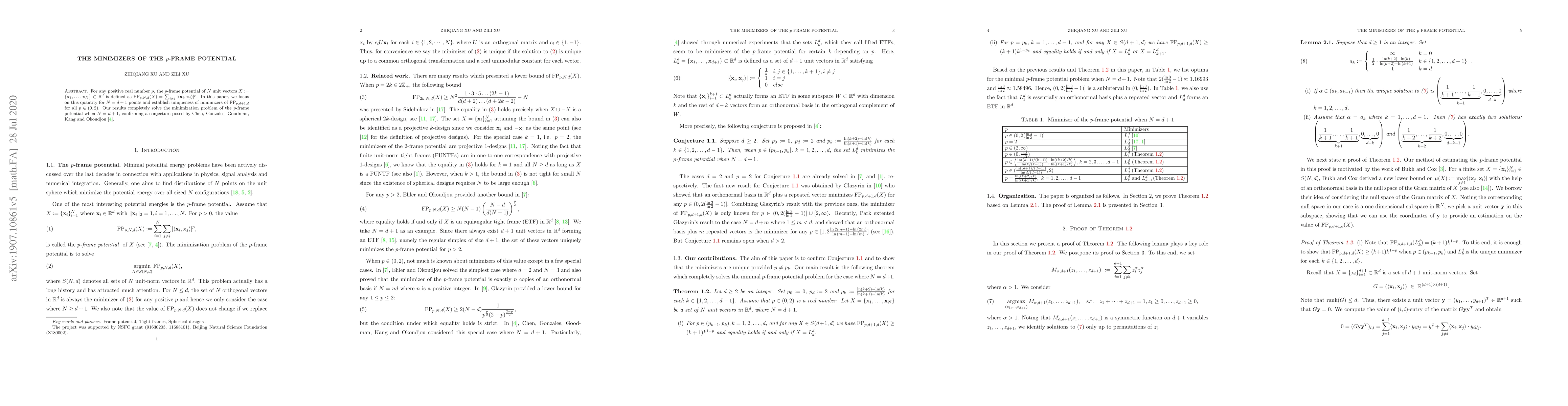 For any positive real number $p$, the $p$-frame potential of $N$ unit vectors $X:=\{\mathbf x_1,\ldots,\mathbf x_N\}\subset \mathbb R^d$ is defined as ${\rm FP}_{p,N,d}(X)=\sum_{i\neq j}|\langle \mathbf x_i,\mathbf x_j\rangle |^p$. In this paper, we focus on the special case $N=d+1$ and establish the unique minimizer of ${\rm FP}_{p,d+1,d}$ for $p\in (0,2)$. Our results completely solve the minimization problem of $p$-frame potential when $N=d+1$, which confirms a conjecture posed by Chen, Gonzales, Goodman, Kang and Okoudjou.