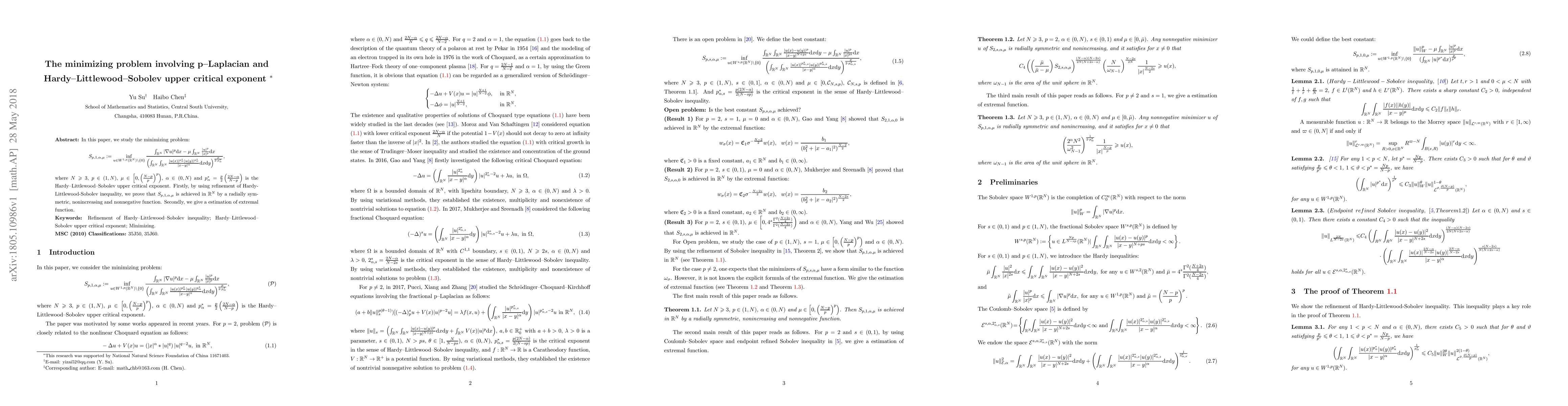 This paper explores the minimizing problem involving the p-Laplacian and the Hardy-Littlewood-Sobolev upper critical exponent. It proves that the problem achieves its minimum through a radially symmetric, nonincreasing, nonnegative function and provides an estimation of the extremal function.