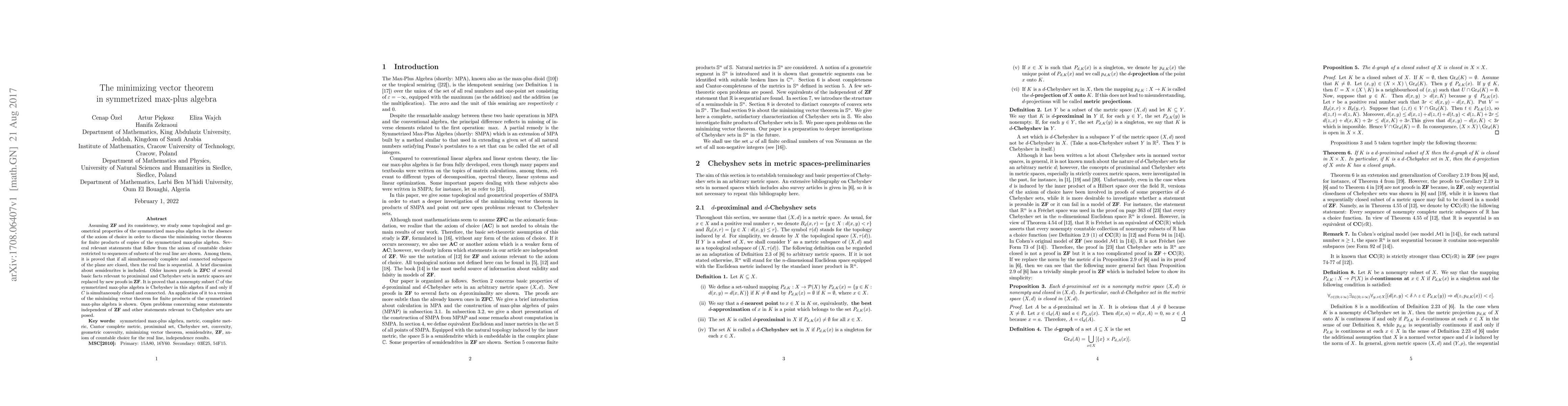 Assuming ZF and its consistency, we study some topological and geometrical properties of the symmetrized max-plus algebra in the absence of the axiom of choice in order to discuss the minimizing vector theorem for finite products of copies of the symmetrized max-plus algebra. Several relevant statements that follow from the axiom of countable choice restricted to sequences of subsets of the real line are shown. Among them, it is proved that if all simultaneously complete and connected subspaces of the plane are closed, then the real line is sequential. A brief discussion about semidenrites is included. Older known proofs in ZFC of several basic facts relevant to proximinal and Chebyshev sets in metric spaces are replaced by new proofs in ZF. It is proved that a nonempty subset C of the symmetrized max-plus algebra is Chebyshev in this algebra if and only if C is simultaneously closed and connected. An application of it to a version of the minimizing vector theorem for finite products of the symmetrized max-plus algebra is shown. Open problems concerning some statements independent of ZF and other statements relevant to Chebyshev sets are posed.