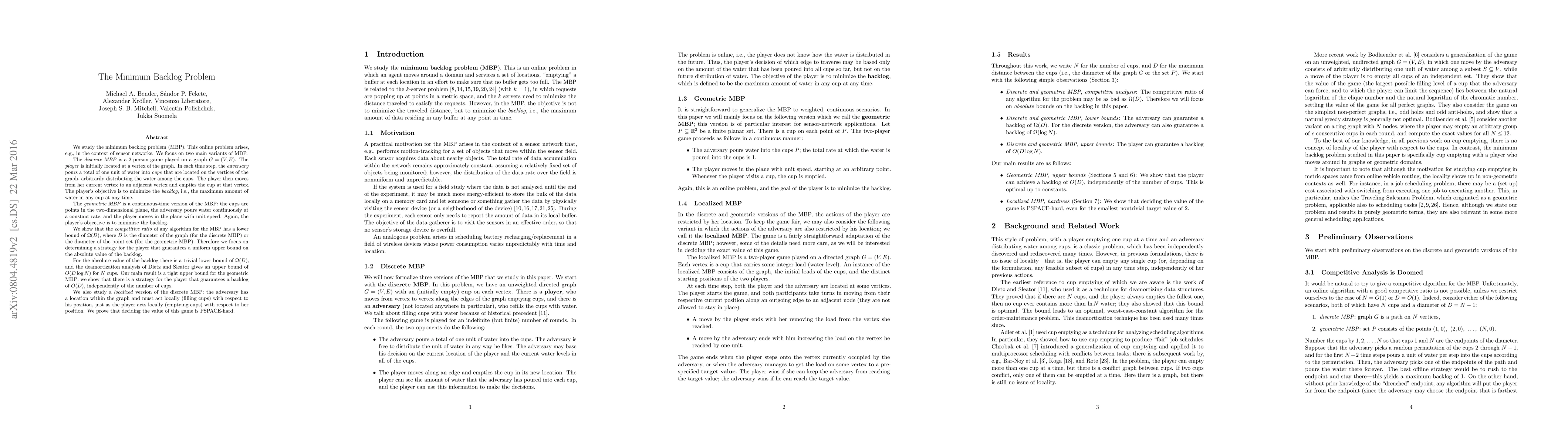 We study the minimum backlog problem (MBP). This online problem arises, e.g., in the context of sensor networks. We focus on two main variants of MBP. The discrete MBP is a 2-person game played on a graph $G=(V,E)$. The player is initially located at a vertex of the graph. In each time step, the adversary pours a total of one unit of water into cups that are located on the vertices of the graph, arbitrarily distributing the water among the cups. The player then moves from her current vertex to an adjacent vertex and empties the cup at that vertex. The player's objective is to minimize the backlog, i.e., the maximum amount of water in any cup at any time. The geometric MBP is a continuous-time version of the MBP: the cups are points in the two-dimensional plane, the adversary pours water continuously at a constant rate, and the player moves in the plane with unit speed. Again, the player's objective is to minimize the backlog. We show that the competitive ratio of any algorithm for the MBP has a lower bound of $\Omega(D)$, where $D$ is the diameter of the graph (for the discrete MBP) or the diameter of the point set (for the geometric MBP). Therefore we focus on determining a strategy for the player that guarantees a uniform upper bound on the absolute value of the backlog. For the absolute value of the backlog there is a trivial lower bound of $\Omega(D)$, and the deamortization analysis of Dietz and Sleator gives an upper bound of $O(D\log N)$ for $N$ cups. Our main result is a tight upper bound for the geometric MBP: we show that there is a strategy for the player that guarantees a backlog of $O(D)$, independently of the number of cups.