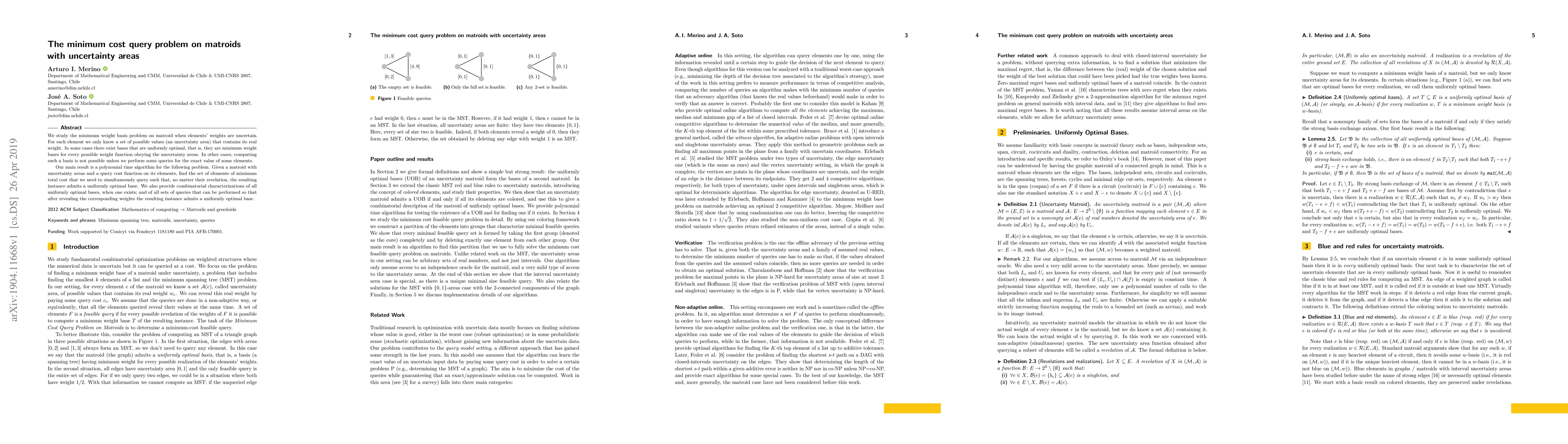 We study the minimum weight basis problem on matroid when elements' weights are uncertain. For each element we only know a set of possible values (an uncertainty area) that contains its real weight. In some cases there exist bases that are uniformly optimal, that is, they are minimum weight bases for every possible weight function obeying the uncertainty areas. In other cases, computing such a basis is not possible unless we perform some queries for the exact value of some elements. Our main result is a polynomial time algorithm for the following problem. Given a matroid with uncertainty areas and a query cost function on its elements, find the set of elements of minimum total cost that we need to simultaneously query such that, no matter their revelation, the resulting instance admits a uniformly optimal base. We also provide combinatorial characterizations of all uniformly optimal bases, when one exists; and of all sets of queries that can be performed so that after revealing the corresponding weights the resulting instance admits a uniformly optimal base.
