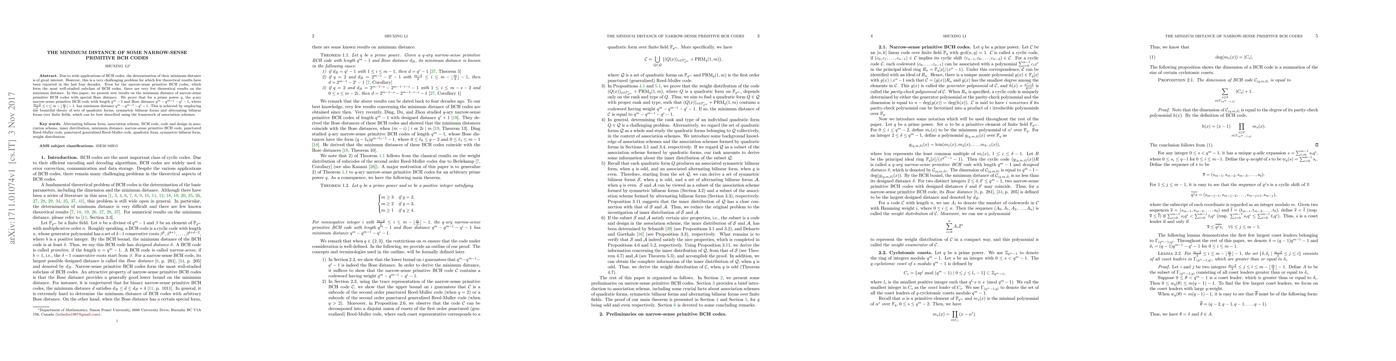 A novel method for determining the minimum distance of narrow-sense primitive BCH codes was developed