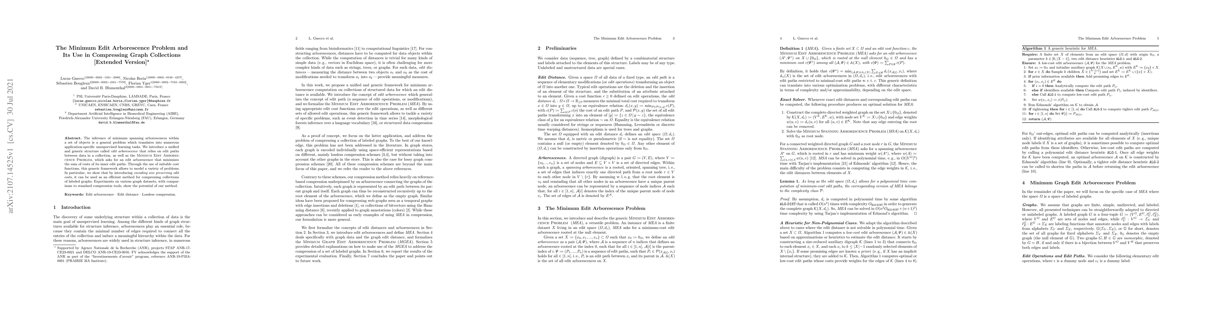The inference of minimum spanning arborescences within a set of objects is a general problem which translates into numerous application-specific unsupervised learning tasks. We introduce a unified and generic structure called edit arborescence that relies on edit paths between data in a collection, as well as the Min Edit Arborescence Problem, which asks for an edit arborescence that minimizes the sum of costs of its inner edit paths. Through the use of suitable cost functions, this generic framework allows to model a variety of problems. In particular, we show that by introducing encoding size preserving edit costs, it can be used as an efficient method for compressing collections of labeled graphs. Experiments on various graph datasets, with comparisons to standard compression tools, show the potential of our method.