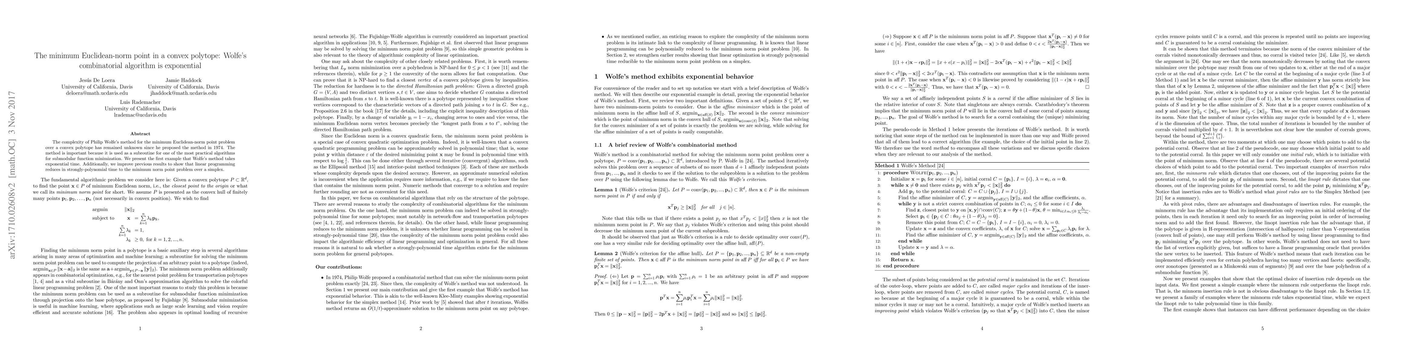 Summary: This paper demonstrates that Philip Wolfe's method for finding the minimum Euclidean-norm point on a convex polytope requires exponential time, resolving its complexity. It also shows that linear programming can be strongly-polynomially reduced to the minimum norm point problem on a simplex.