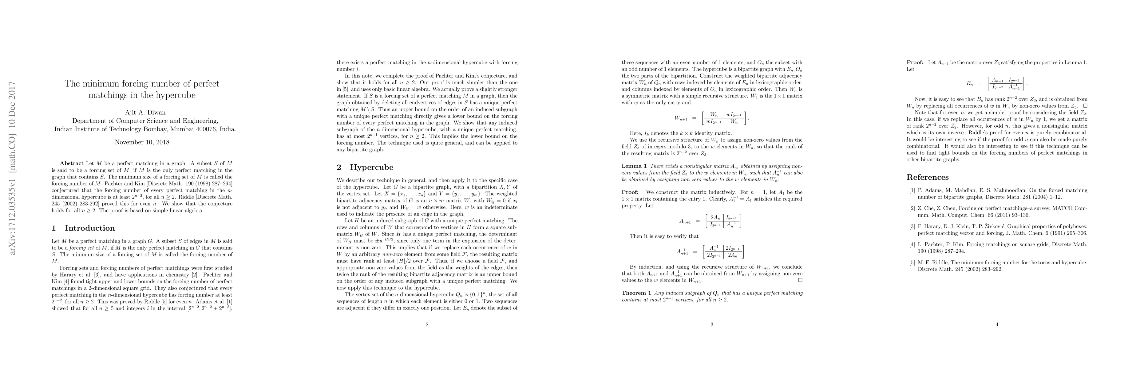 Let $M$ be a perfect matching in a graph. A subset $S$ of $M$ is said to be a forcing set of $M$, if $M$ is the only perfect matching in the graph that contains $S$. The minimum size of a forcing set of $M$ is called the forcing number of $M$. Pachter and Kim [Discrete Math. 190 (1998) 287--294] conjectured that the forcing number of every perfect matching in the $n$-dimensional hypercube is at least $2^{n-2}$, for all $n \ge 2$. Riddle [Discrete Math. 245 (2002) 283-292] proved this for even $n$. We show that the conjecture holds for all $n \ge 2$. The proof is based on simple linear algebra.