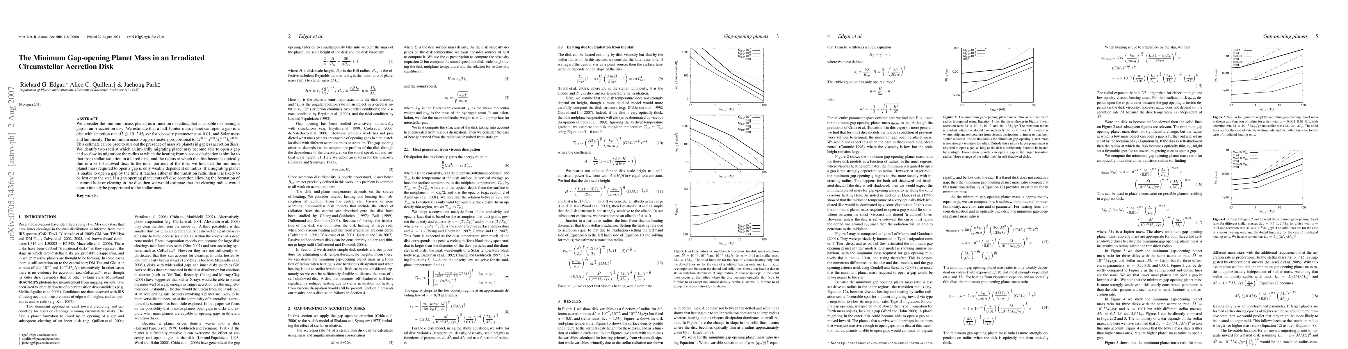We consider the minimum mass planet, as a function of radius, that is capable of opening a gap in an $\alpha$-accretion disk. We estimate that a half Jupiter mass planet can open a gap in a disk with accretion rate $\dot M \la 10^{-8} M_\odot$/yr for viscosity parameter $\alpha =0.01$, and Solar mass and luminosity. The minimum mass is approximately proportional to $\dot M^{0.48} \alpha^{0.8} M_*^{0.42} L_*^{-0.08}$. This estimate can be used to rule out the presence of massive planets in gapless accretion disks. We identify two radii at which an inwardly migrating planet may become able to open a gap and so slow its migration; the radius at which the heating from viscous dissipation is similar to that from stellar radiation in a flared disk, and the radius at which the disk has optical depth order 1 in a self-shadowed disk. If a gap opening planet cuts off disk accretion allowing the formation of a central hole or clearing in the disk then we would estimate that the clearing radius would approximately be proportional to the stellar mass.