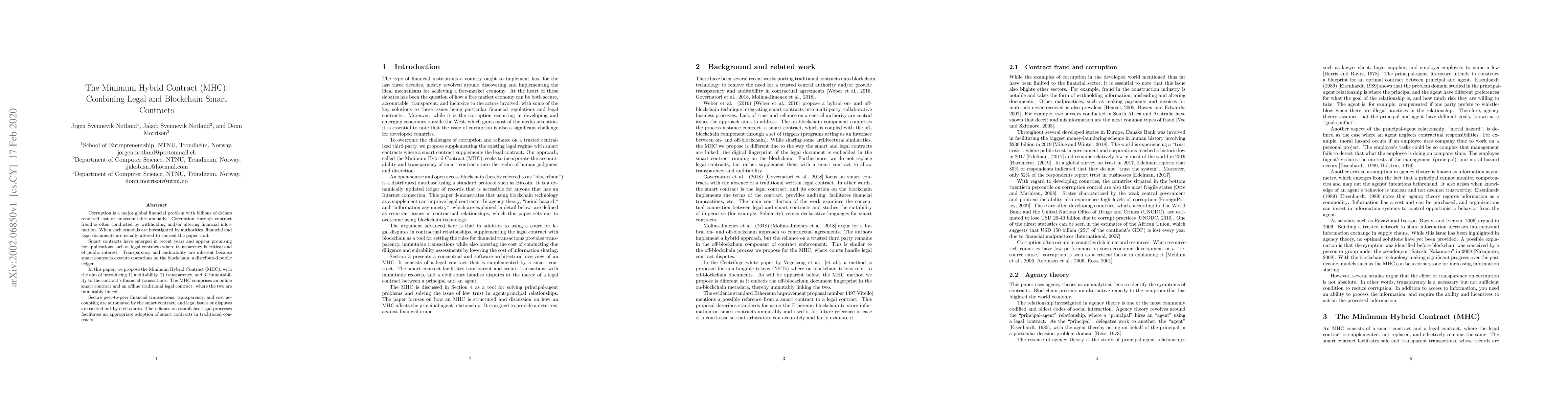 This paper proposes the Minimum Hybrid Contract (MHC) to combine legal and blockchain smart contracts, aiming to enhance transparency, auditability, and immutability in financial transactions. The MHC integrates an online smart contract with an offline traditional legal contract, leveraging blockchain for automated secure transactions while maintaining legal dispute resolution.