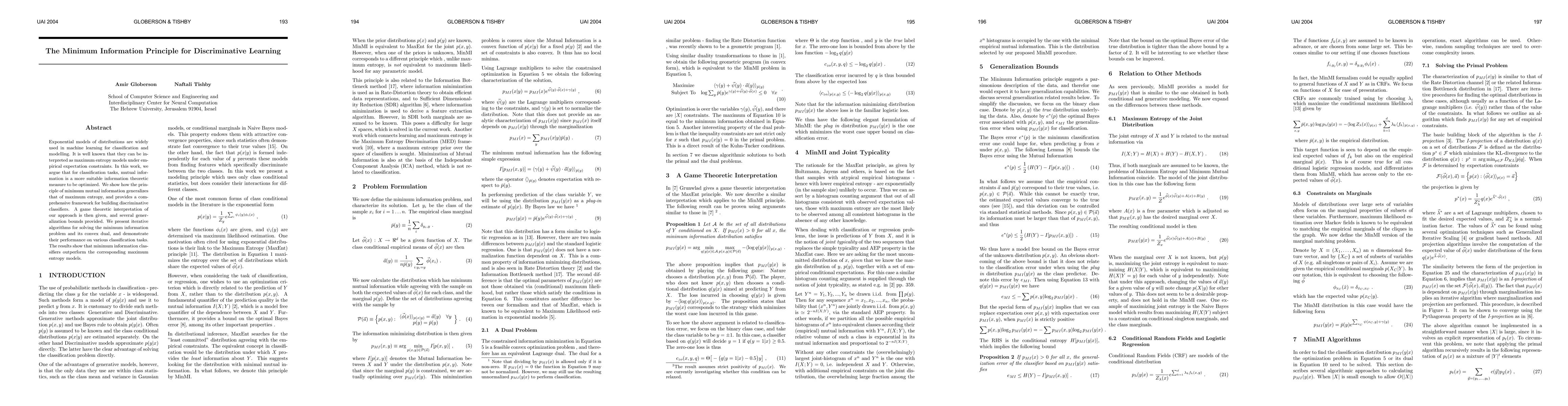 Exponential models of distributions are widely used in machine learning for classiffication and modelling. It is well known that they can be interpreted as maximum entropy models under empirical expectation constraints. In this work, we argue that for classiffication tasks, mutual information is a more suitable information theoretic measure to be optimized. We show how the principle of minimum mutual information generalizes that of maximum entropy, and provides a comprehensive framework for building discriminative classiffiers. A game theoretic interpretation of our approach is then given, and several generalization bounds provided. We present iterative algorithms for solving the minimum information problem and its convex dual, and demonstrate their performance on various classiffication tasks. The results show that minimum information classiffiers outperform the corresponding maximum entropy models.