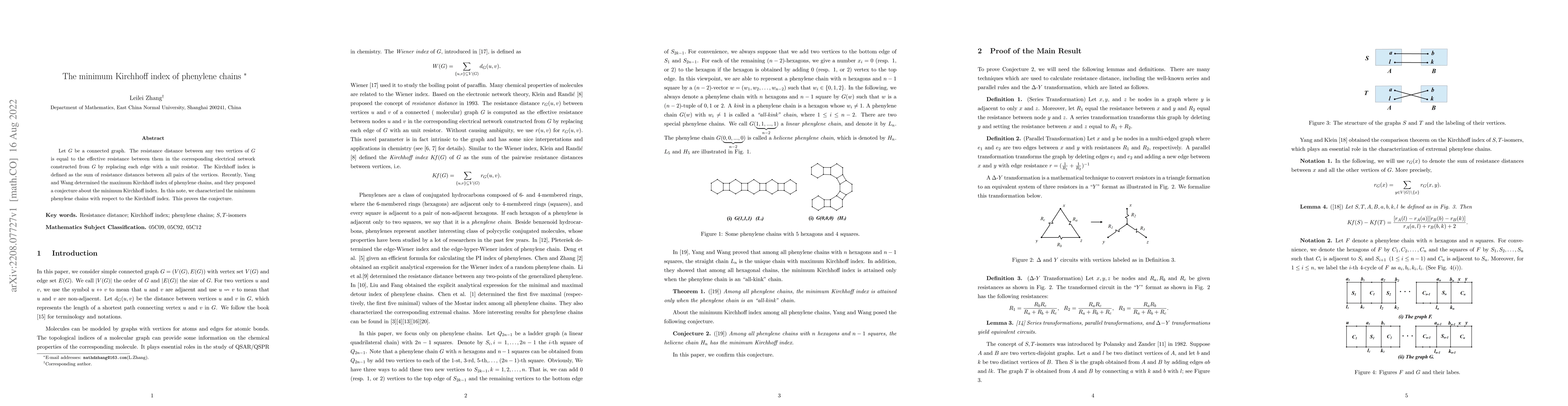 This paper characterizes the minimum Kirchhoff index for phenylene chains, confirming a conjecture about the effective resistance distances in these structures. It provides a definitive solution for the lowest Kirchhoff index among phenylene chains.