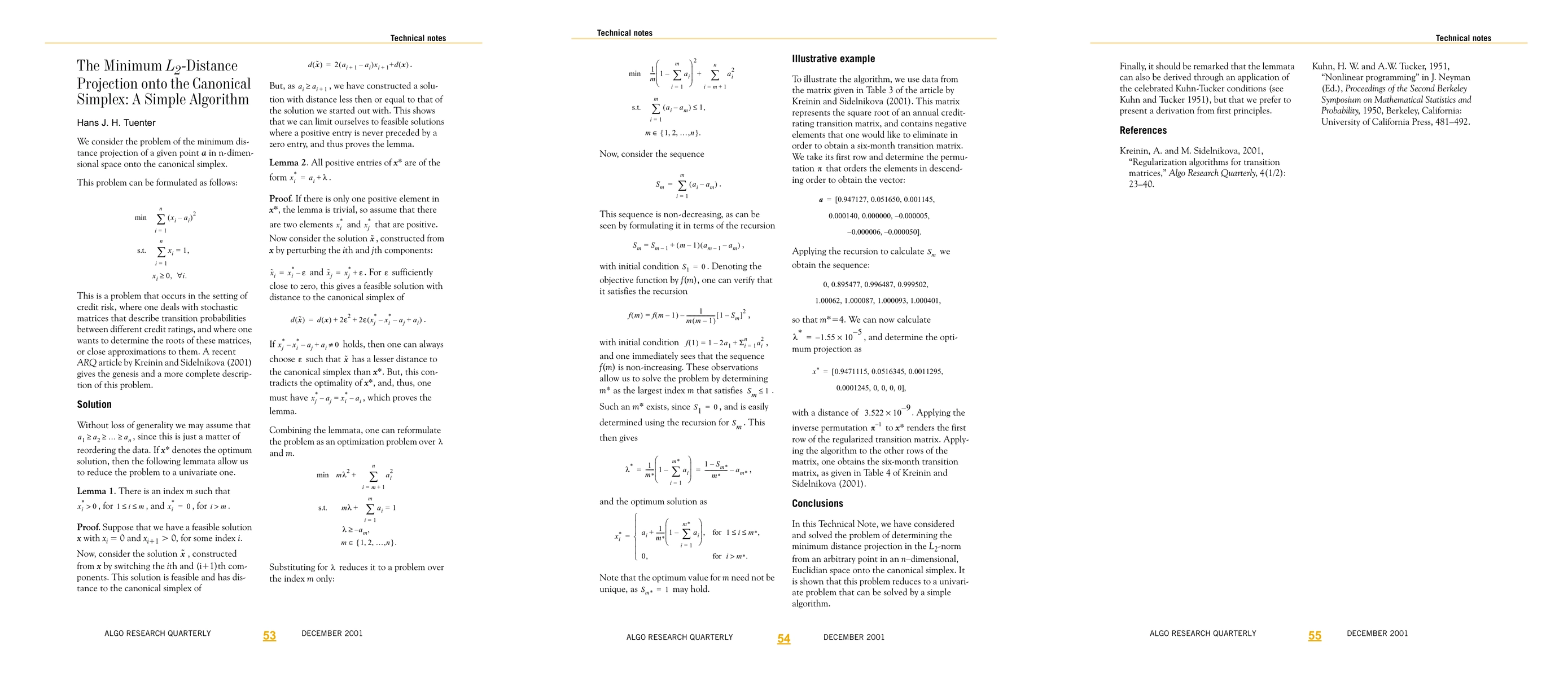 The paper presents a simple algorithm to find the minimum $L_2$-distance projection of any point in an $n$-dimensional space onto the canonical simplex, reducing the problem to a univariate optimization. This technique is particularly useful in credit risk analysis for approximating the roots of stochastic matrices representing credit rating transitions.