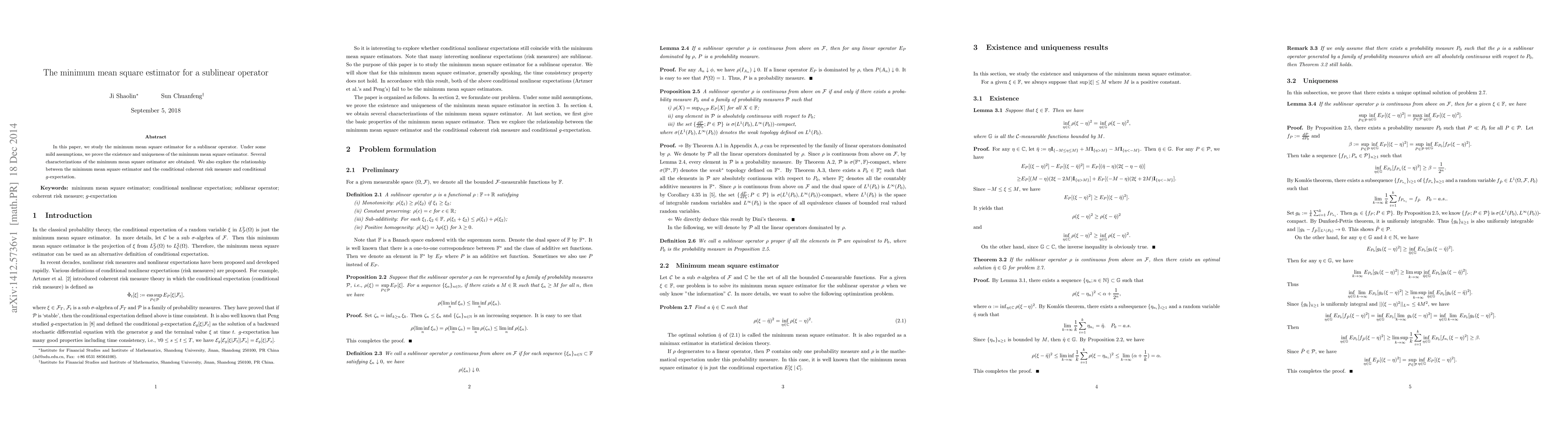 This paper explores the existence and uniqueness of the minimum mean square estimator for a sublinear operator, proving several characterizations and examining its relationship with conditional coherent risk measures and conditional g-expectations under mild assumptions.