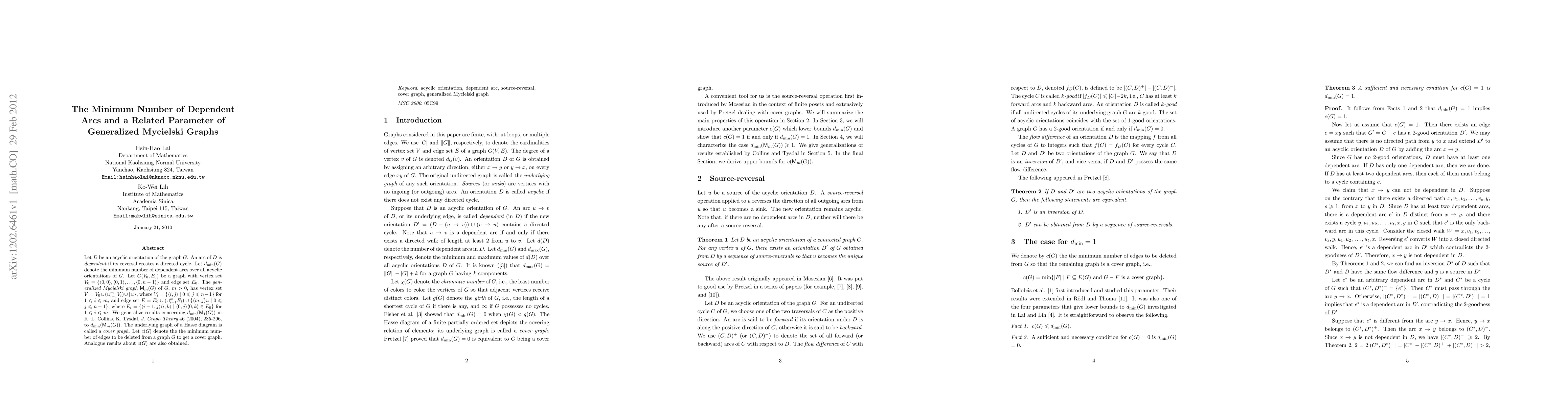 This paper investigates the minimum number of dependent arcs, m(G), in generalized Mycielski graphs M_k(G) and extends previous results on m(M_1(G)). It also explores the parameter c(G), which represents the minimum edges to delete to transform a graph into a cover graph.