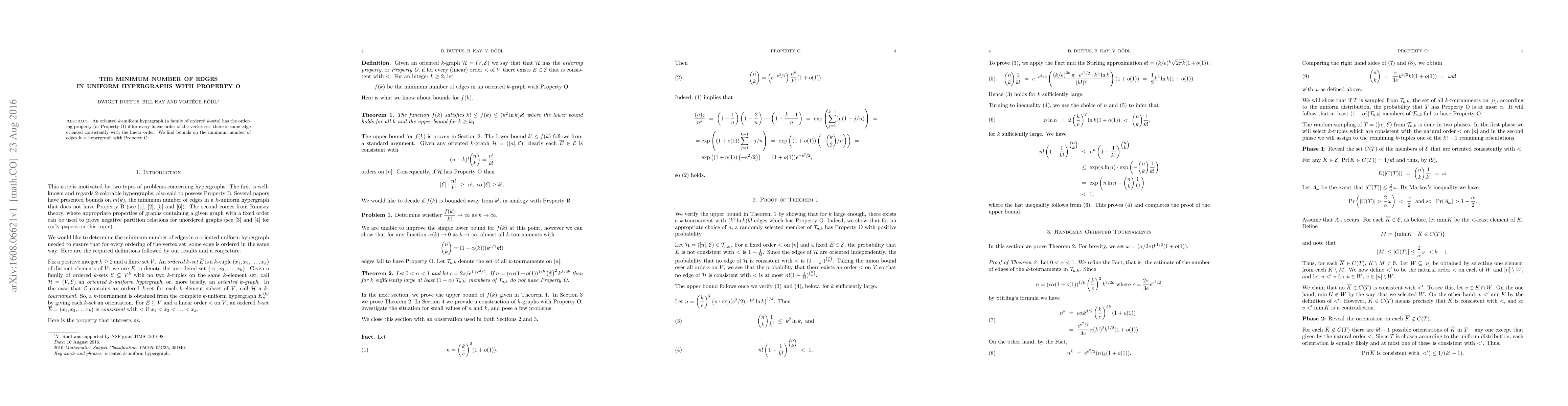 An oriented k-uniform hypergraph (a family of ordered k-sets) has the ordering property (or Property O) if for every linear order of the vertex set, there is some edge oriented consistently with the linear order. We find bounds on the minimum number of edges in a hypergraph with Property O.