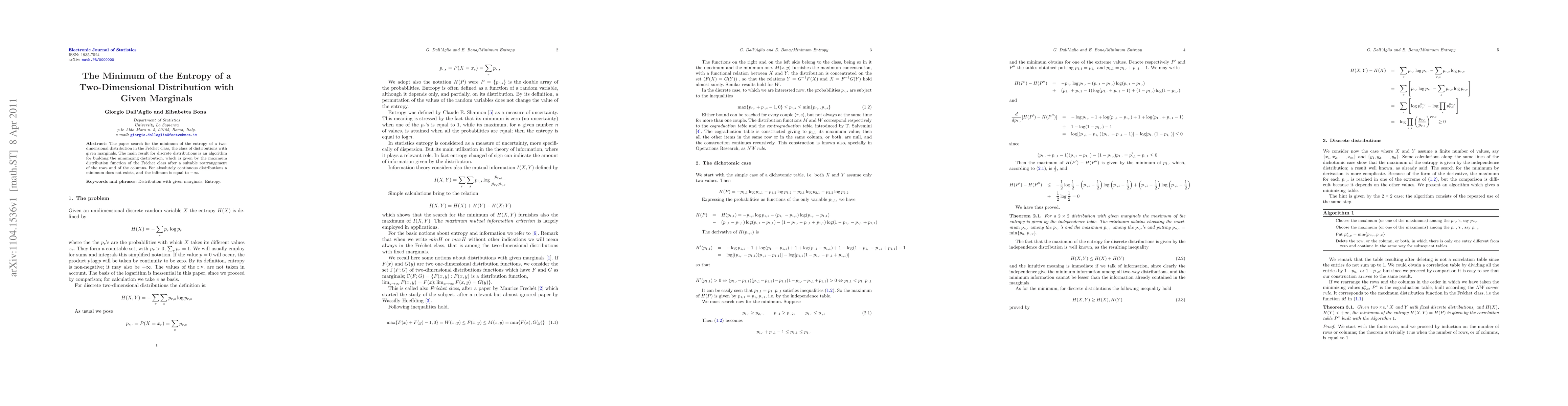 The paper develops an algorithm to find the minimum entropy two-dimensional distribution within the Fr\'echet class, achieving this by rearranging the rows and columns for discrete distributions. For continuous distributions, it concludes that the minimum entropy does not exist, with the infimum being -\infty.