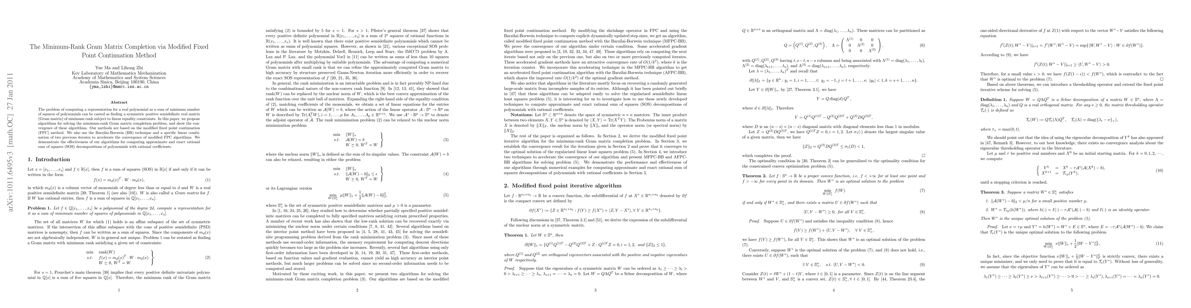 This paper proposes algorithms based on a modified fixed point continuation method to solve the minimum-rank Gram matrix completion problem, demonstrating their convergence and effectiveness. The Barzilai-Borwein technique and a specific linear combination are used to accelerate convergence, showing successful application in computing rational sum of squares decompositions.