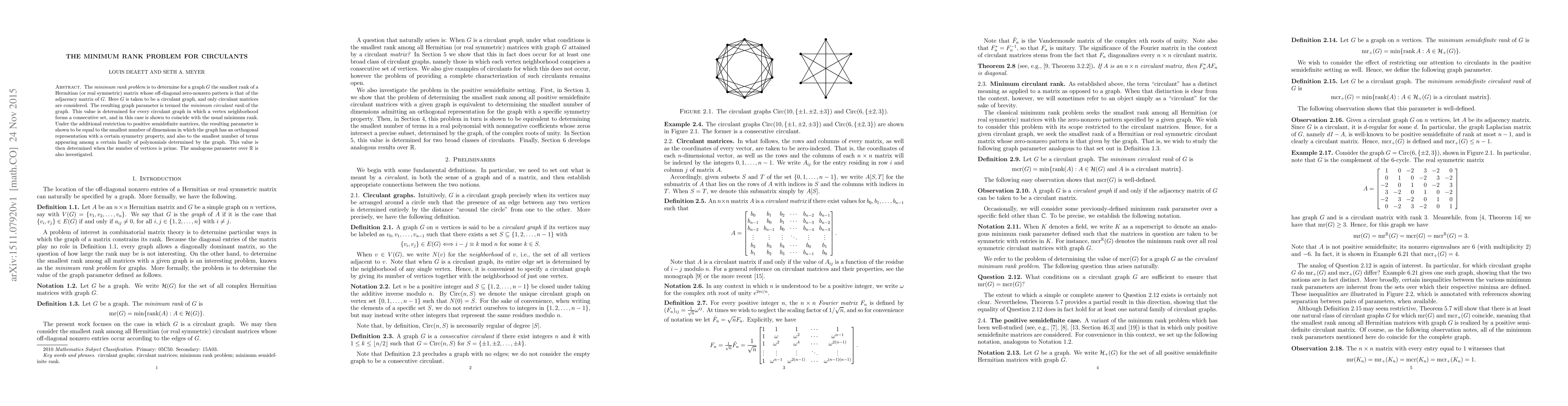 The minimum rank problem is to determine for a graph $G$ the smallest rank of a Hermitian (or real symmetric) matrix whose off-diagonal zero-nonzero pattern is that of the adjacency matrix of $G$. Here $G$ is taken to be a circulant graph, and only circulant matrices are considered. The resulting graph parameter is termed the minimum circulant rank of the graph. This value is determined for every circulant graph in which a vertex neighborhood forms a consecutive set, and in this case is shown to coincide with the usual minimum rank. Under the additional restriction to positive semidefinite matrices, the resulting parameter is shown to be equal to the smallest number of dimensions in which the graph has an orthogonal representation with a certain symmetry property, and also to the smallest number of terms appearing among a certain family of polynomials determined by the graph. This value is then determined when the number of vertices is prime. The analogous parameter over the reals is also investigated.