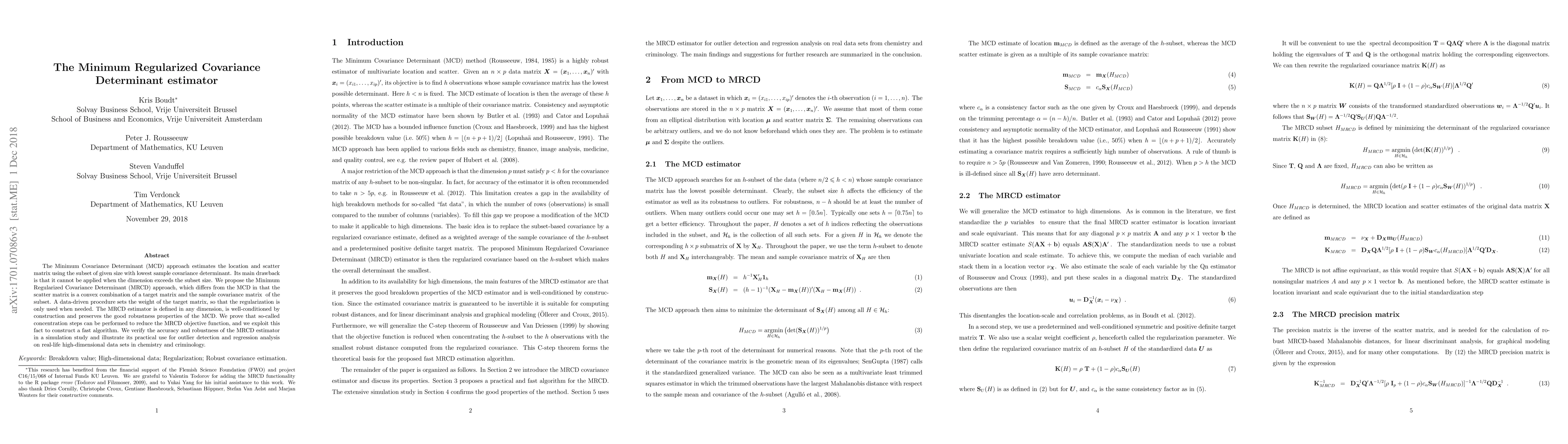 The Minimum Regularized Covariance Determinant (MRCD) estimator extends the robust Minimum Covariance Determinant (MCD) approach by incorporating regularization, allowing its application in any dimension while maintaining robustness. This method uses a convex combination of a target matrix and the sample covariance matrix, with a data-driven weight adjustment, and is validated through simulations and real-life data applications.