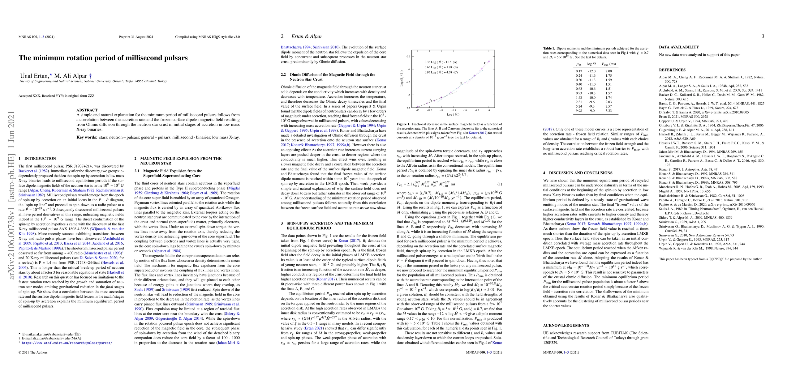 A simple and natural explanation for the minimum period of millisecond pulsars follows from a correlation between the accretion rate and the frozen surface dipole magnetic field resulting from Ohmic diffusion through the neutron star crust in initial stages of accretion in low mass X-ray binaries.