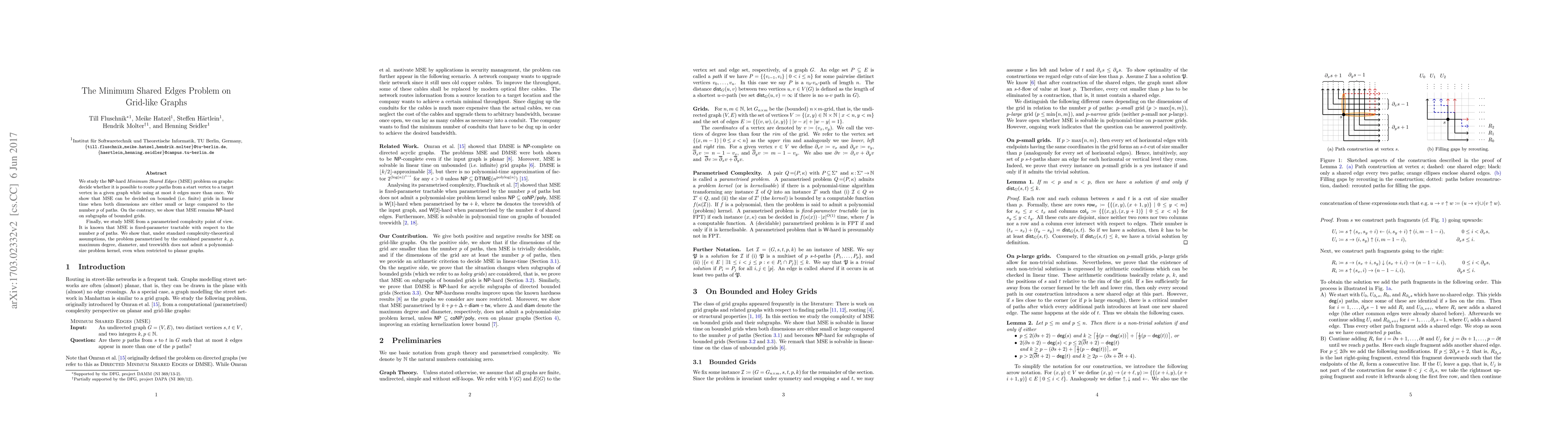 This research explores the Minimum Shared Edges (MSE) problem on grid-like graphs, proving MSE can be solved in linear time for bounded grids with small or large dimensions relative to path number $p$. Conversely, MSE remains NP-hard on subgraphs of bounded grids. The study also reveals, under complexity assumptions, that MSE doesn't have a polynomial-size problem kernel when parameterized by $k$, $p$, maximum degree, diameter, and treewidth, even in planar graphs.