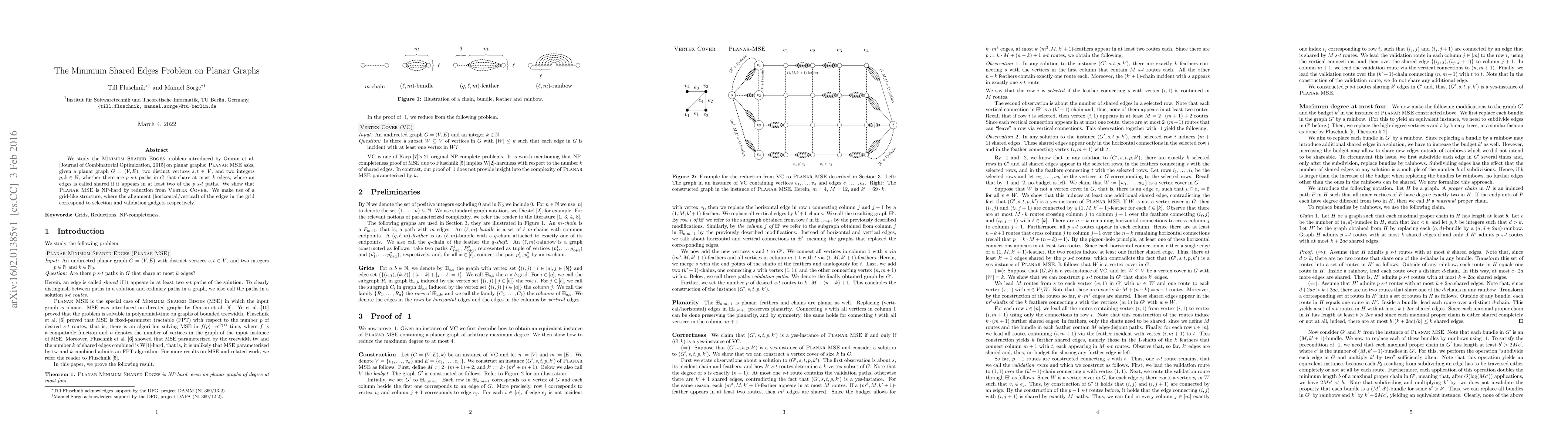 This research paper studies the Minimum Shared Edges problem on planar graphs, showing it is NP-hard using a reduction from Vertex Cover, and proposing a grid-like structure for solving the problem.