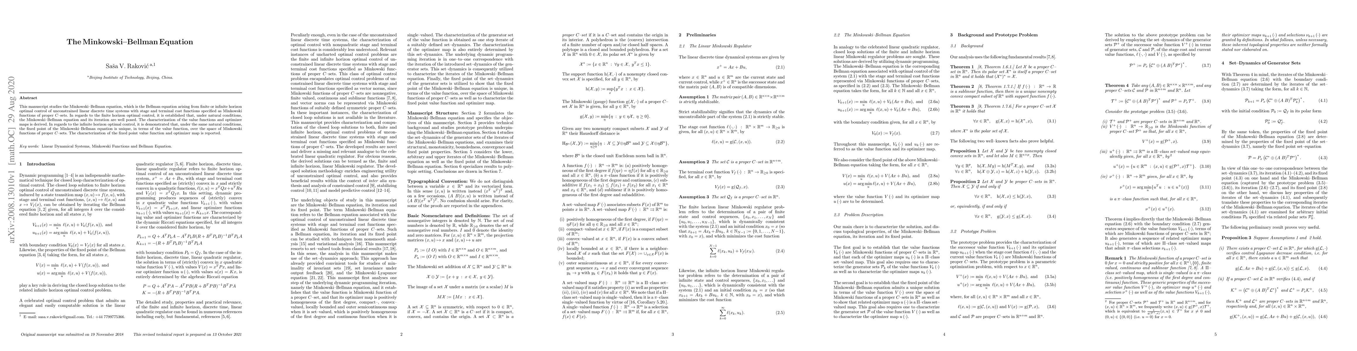 The Minkowski-Bellman equation is studied for finite and infinite horizon optimal control of linear systems with specific cost functions, showing that it has a unique fixed point under natural conditions.