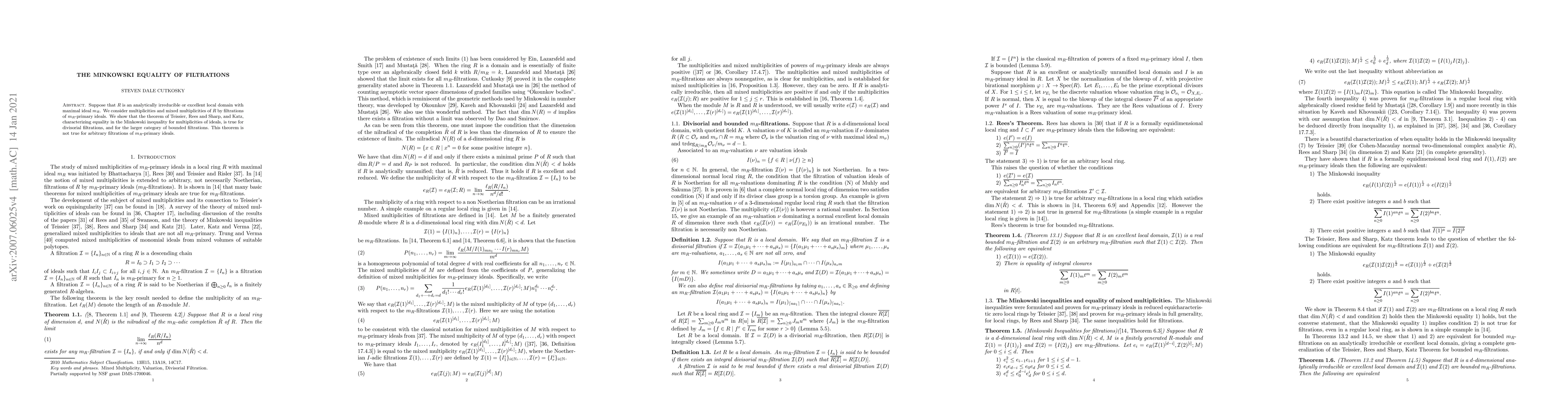 Suppose that R is an analytically irreducible or excellent local domain with maximal ideal m_R. We consider multiplicities and mixed multiplicities of R by filtrations of m_R-primary ideals. We show that the theorem of Teissier, Rees and Sharp, and Katz, characterizing equality in the Minkowski inequality for multiplicities of ideals, is true for divisorial filtrations, and for the larger category of bounded filtrations. This theorem is not true for arbitrary filtrations of m_R-primary ideals.