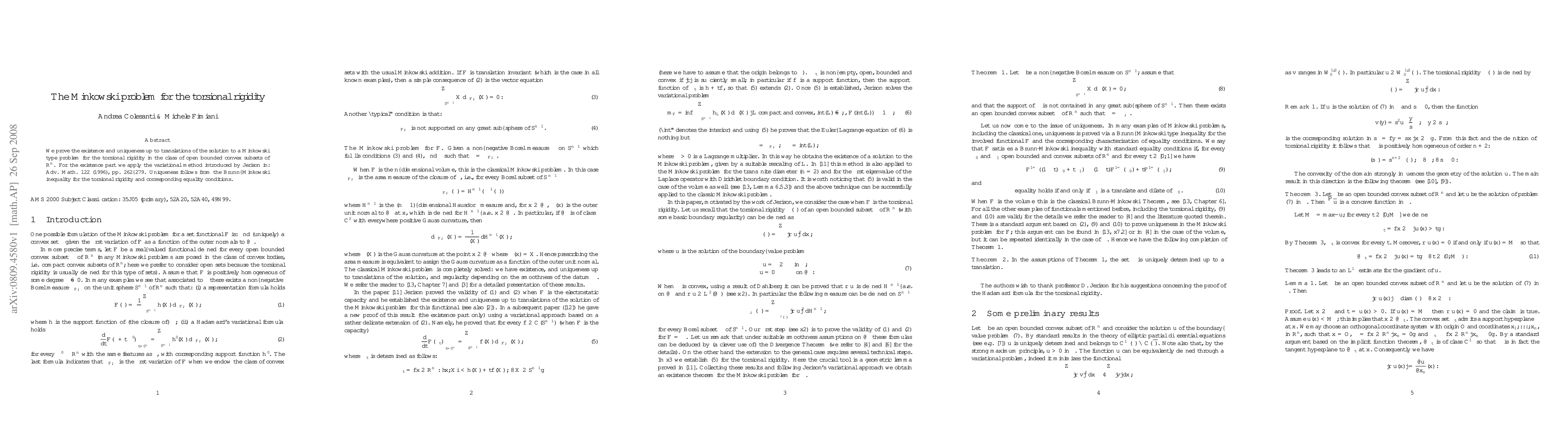 We prove the existence and uniqueness up to translations of the solution to a Minkowski type problem for the torsional rigidity in the class of open bounded convex subsets of the $n$-dimensional Euclidean space. For the existence part we apply the variational method introduced by Jerison for analogous problems concerning other variational functionals. Uniqueness follows from the Brunn--Minkowski inequality for the torsional rigidity and corresponding equality conditions.