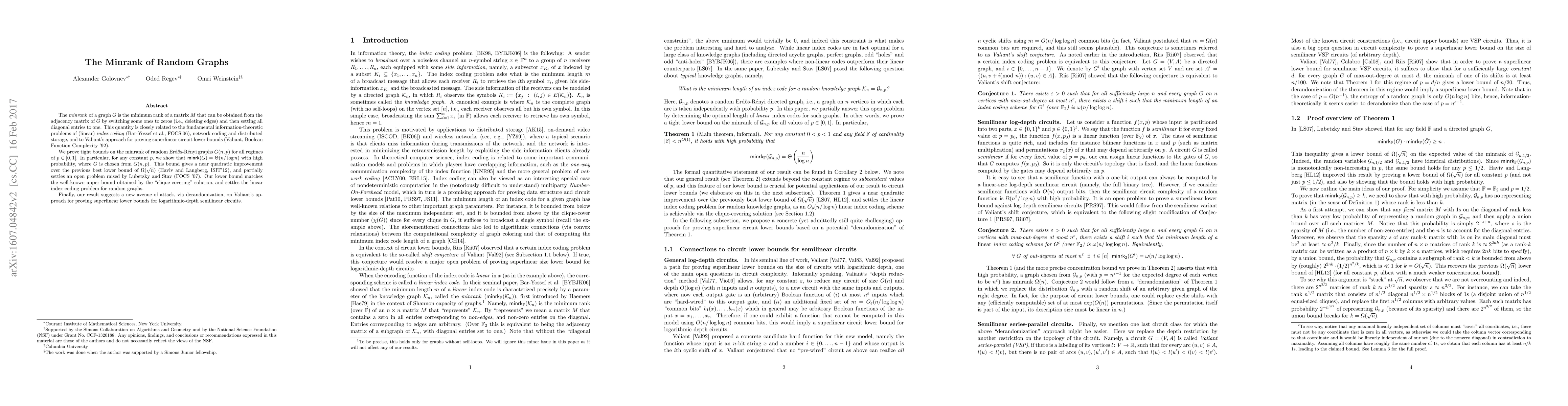 This paper establishes tight bounds on the minrank of random Erdős-Rényi graphs, showing $\mathsf{minrk}(G) = \Theta(n/\log n)$ with high probability for constant $p$, improving previous lower bounds and resolving the linear index coding problem for such graphs. The findings also hint at potential derandomization strategies for proving superlinear circuit lower bounds.
