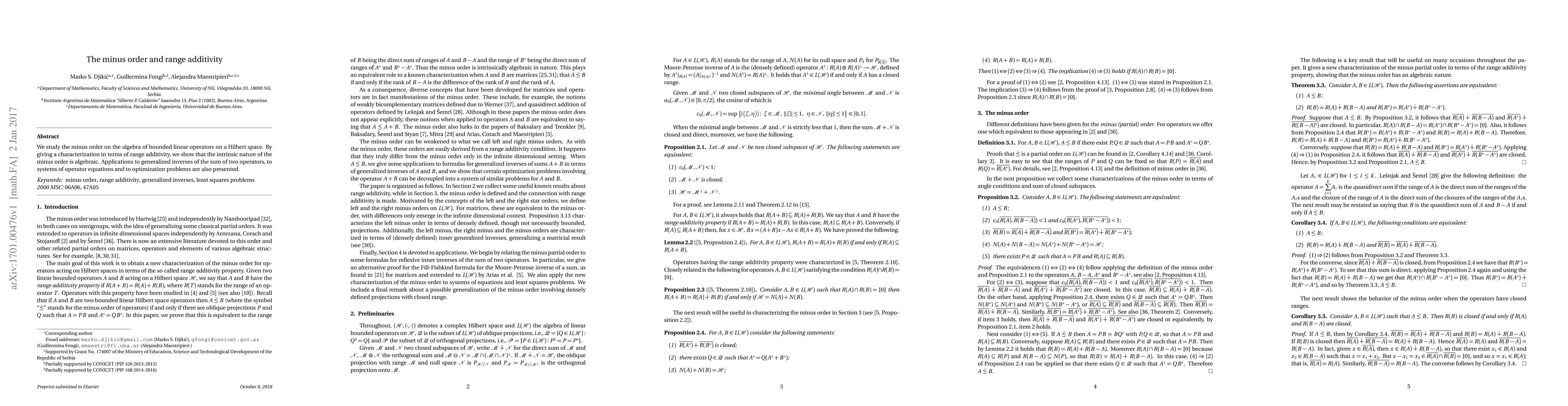 This paper characterizes the minus order on the algebra of bounded linear operators in terms of range additivity, demonstrating its algebraic nature. It also explores applications to generalized inverses, operator equations, and optimization problems.