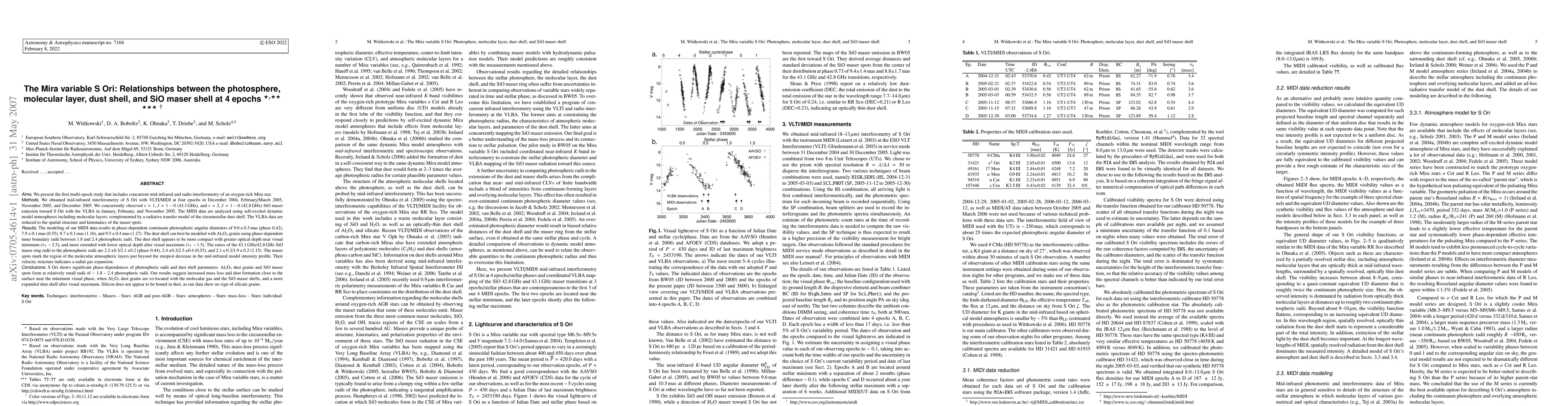 This study investigates the oxygen-rich Mira variable S Ori using multi-epoch mid-infrared and radio interferometry, revealing relationships between its photosphere, molecular layer, dust shell, and SiO maser shell. The findings suggest increased mass loss and dust formation near the star's surface during visual minimum, with no evidence of silicate grains.