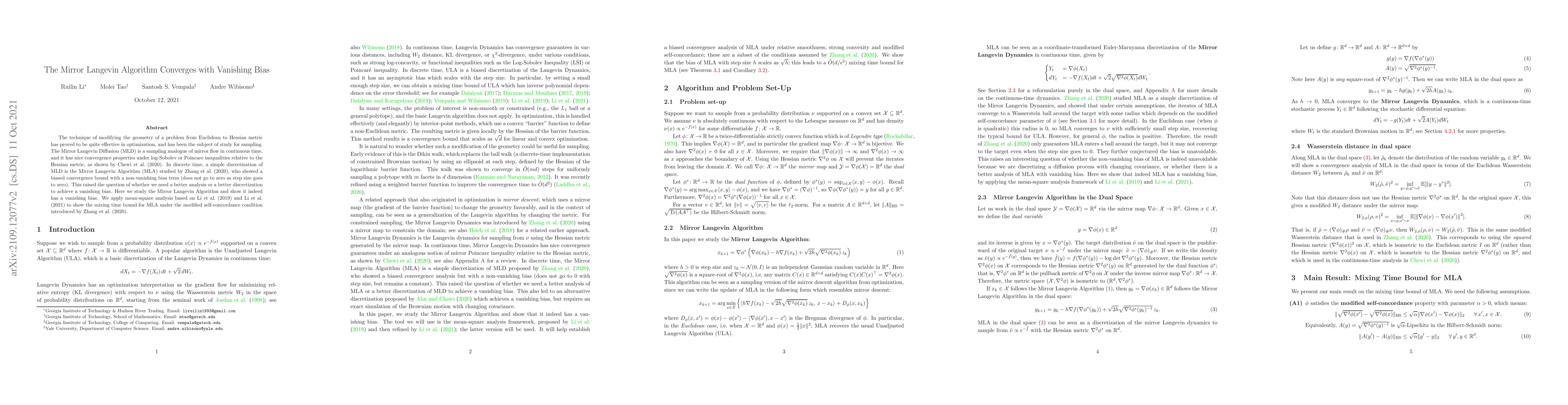 The Mirror Langevin Algorithm converges with a vanishing bias when analyzed using mean-square methods, resolving concerns about its convergence properties in discrete time.