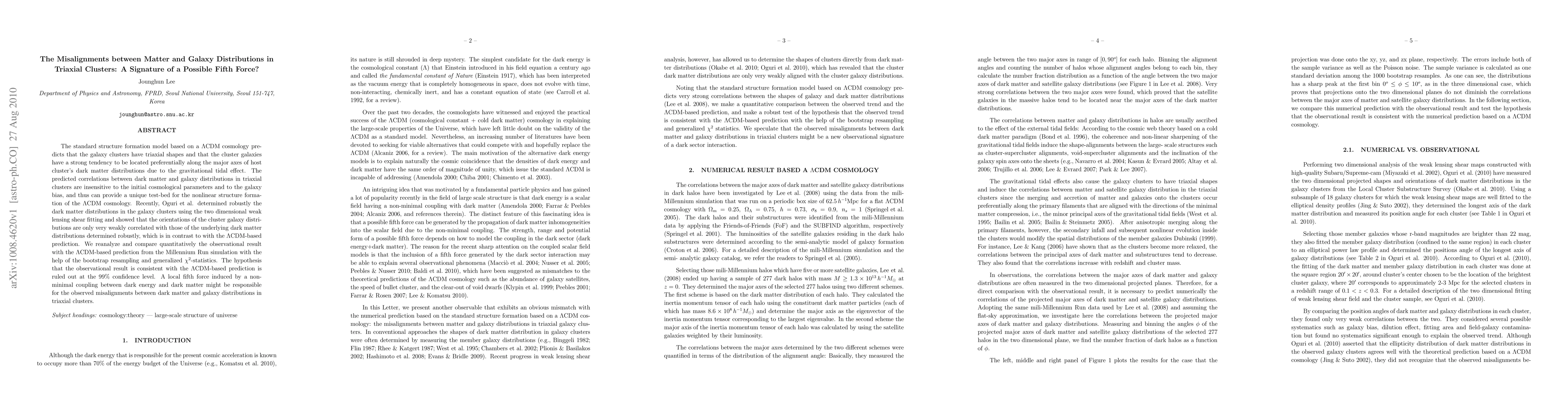 This paper investigates the misalignments between dark matter and galaxy distributions in triaxial clusters, finding that observed orientations are weakly correlated with predictions from LCDM cosmology. The hypothesis of consistency is ruled out at 99% confidence, suggesting a possible fifth force due to non-minimal dark energy-dark matter coupling.