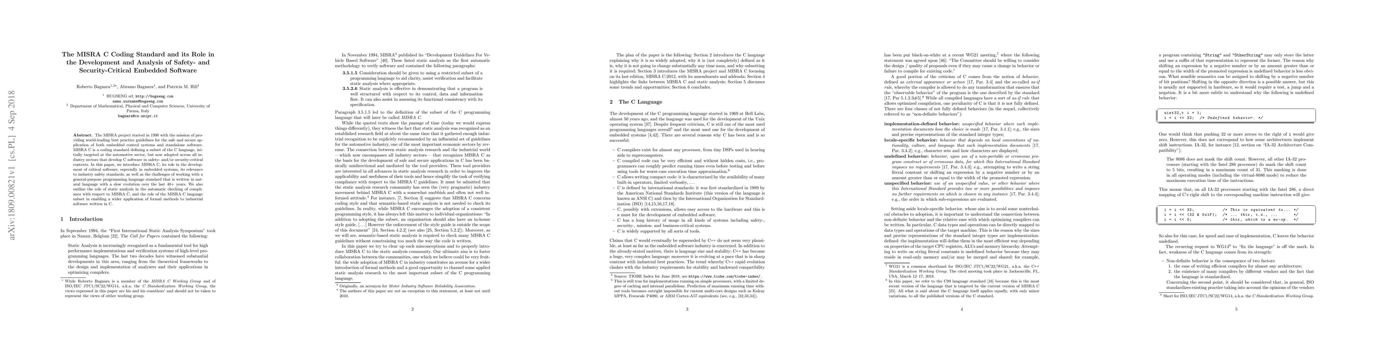 This paper discusses MISRA C, a coding standard for safe and secure embedded software, emphasizing its role in critical software development and its relevance to industry safety standards. It also explores the challenges of using a natural language-based standard and the use of static analysis for compliance.
