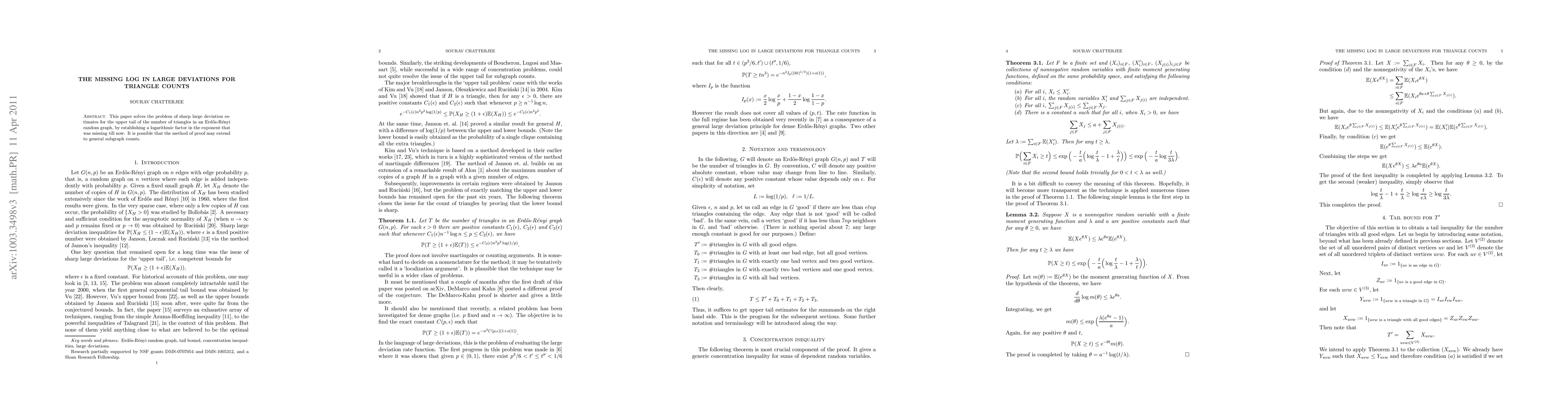This paper solves the problem of sharp large deviation estimates for the upper tail of the number of triangles in an Erdos-Renyi random graph, by establishing a logarithmic factor in the exponent that was missing till now. It is possible that the method of proof may extend to general subgraph counts.