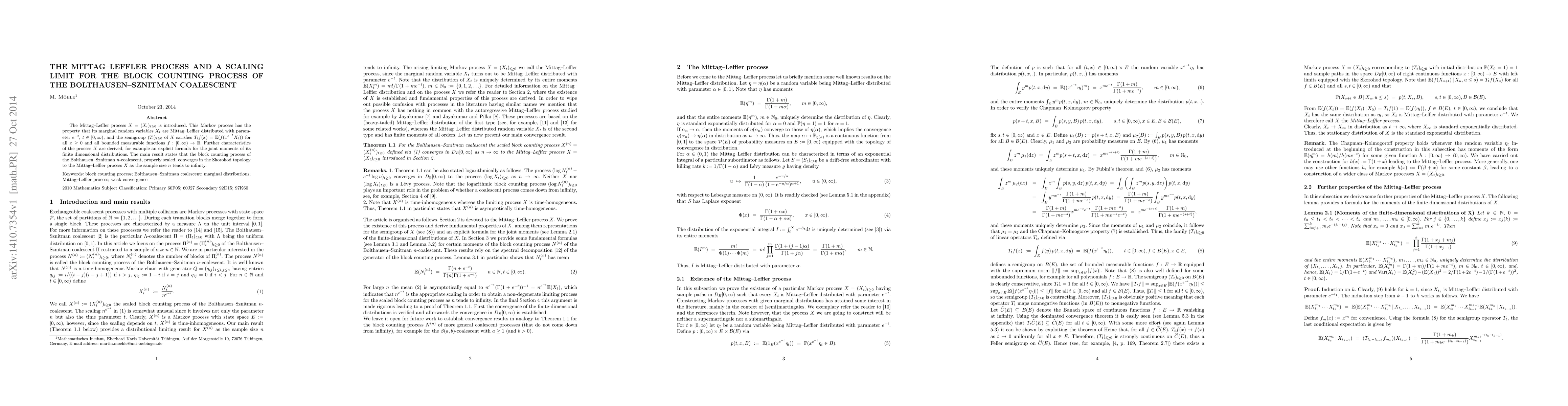 The paper introduces the Mittag-Leffler process, a Markov process with specific marginal distributions and a semigroup, and derives its joint moments. It concludes that the scaled block counting process of the Bolthausen-Sznitman coalescent converges to this Mittag-Leffler process as the sample size increases.