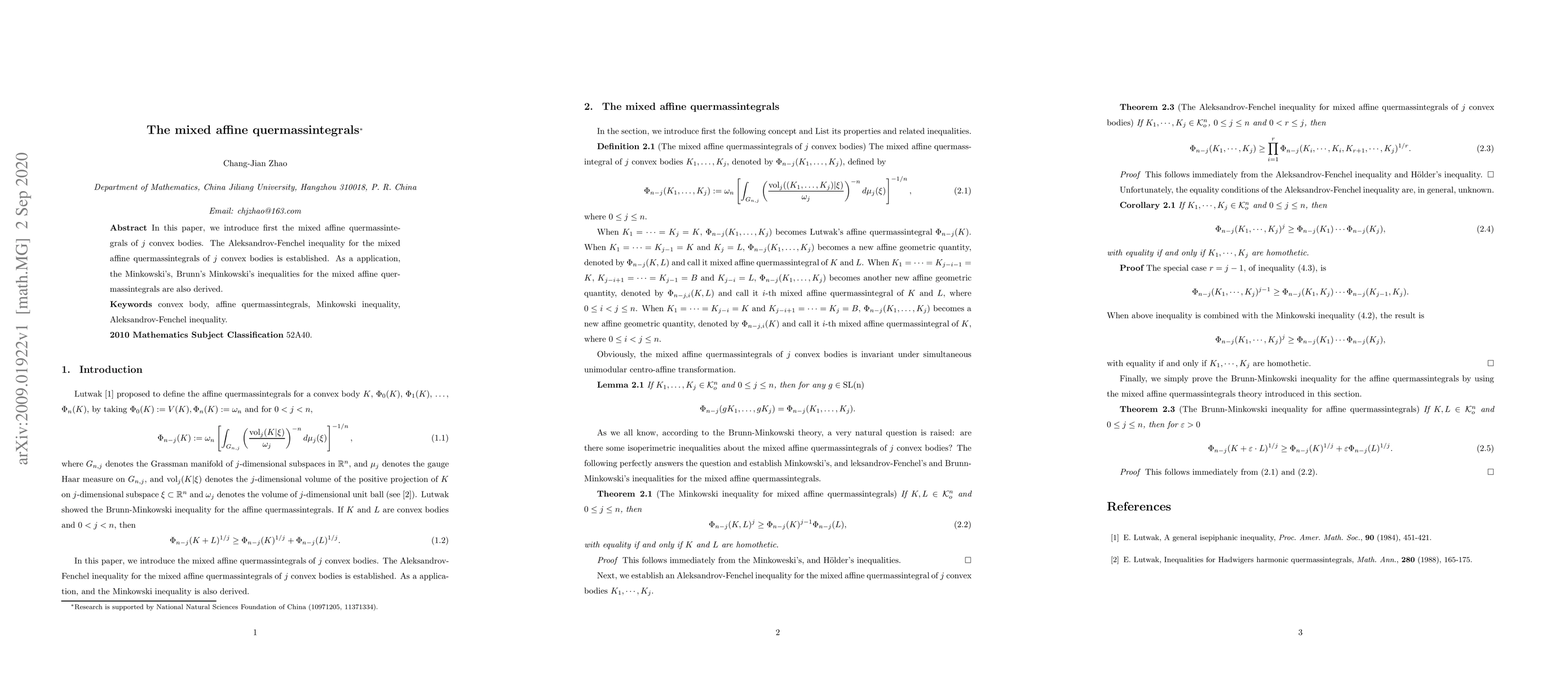 In this paper, we introduce first the mixed affine quermassintegrals. The Aleksandrov-Fenchel inequality for the mixed affine quermassintegrals is established. As an application, the Minkowski, Brunn-Minkowski inequalities for the mixed affine quermassintegrals are also derived.