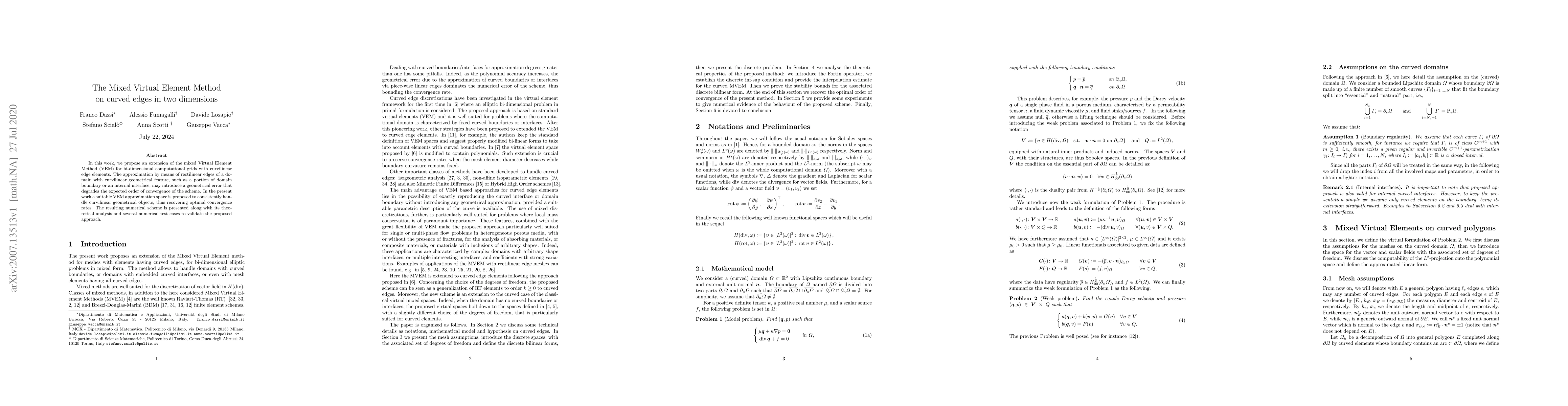 This paper extends the mixed Virtual Element Method (VEM) to handle bi-dimensional grids with curvilinear edge elements, proposing a new approximation space to accurately represent curved geometrical features and recover optimal convergence rates. The method is theoretically analyzed and validated through numerical tests.