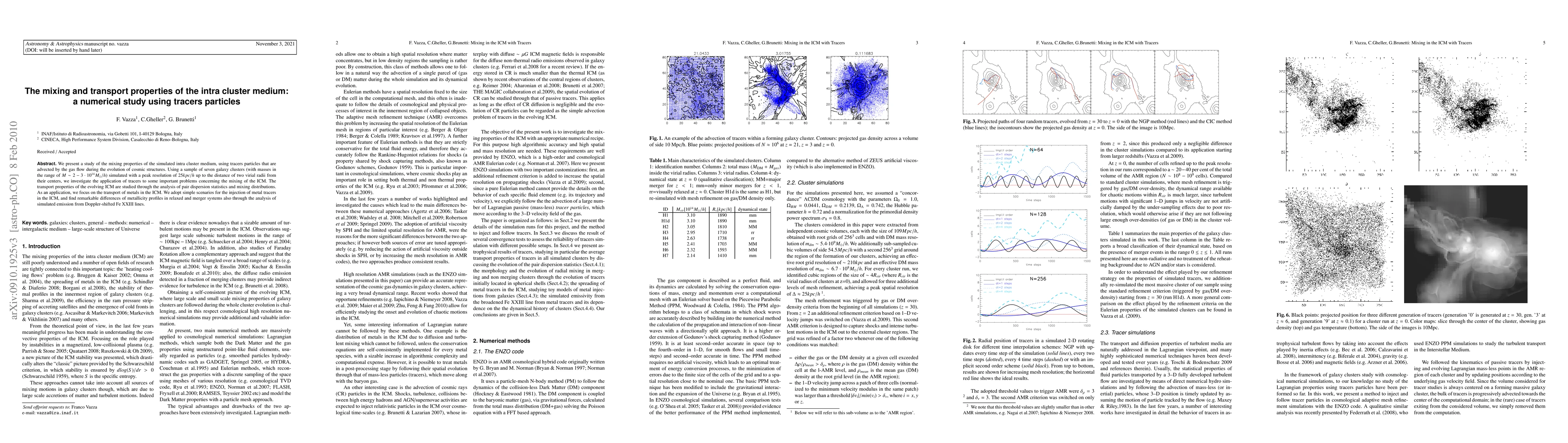 We present a study of the mixing properties of the simulated intra cluster Medium, using tracers particles that are advected by the gas flow during the evolution of cosmic structures. Using a sample of seven galaxy clusters (with masses in the range of M=2-3 10^14Msol/h) simulated with a peak resolution of 25kpc/h up to the distance of two virial radii from their centers, we investigate the application of tracers to some important problems concerning the mixing of the ICM. The transport properties of the evolving ICM are studied through the analysis of pair dispersion statistics and mixing distributions. As an application, we focus on the transport of metals in the ICM. We adopt simple scenarios for the injection of metal tracers in the ICM, and find remarkable differences of metallicity profiles in relaxed and merger systems, also through the analysis of simulated emission from Doppler-shifted Fe XXIII lines.