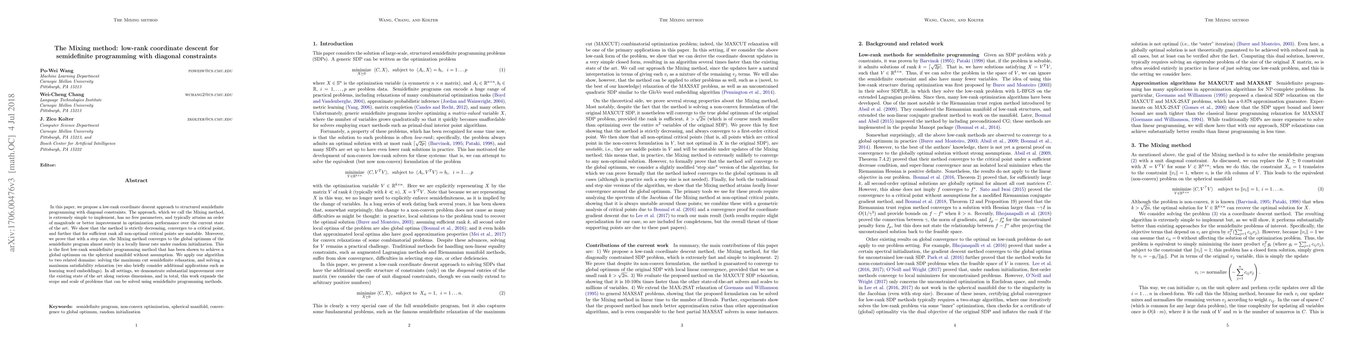 This paper proposes a low-rank coordinate descent method called the Mixing method for structured semidefinite programming with diagonal constraints, demonstrating significant performance improvements over existing methods. The method is shown to converge to the global optimum almost surely under random initialization.