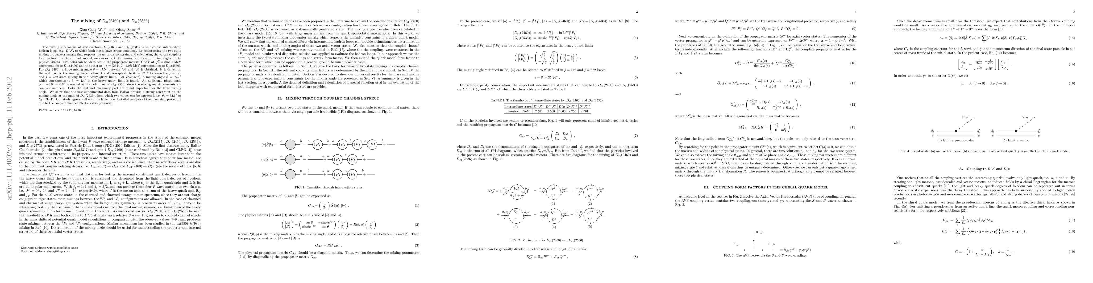 The mixing mechanism of axial-vectors $D_{s1}(2460)$ and $D_{s1}(2536)$ is studied via intermediate hadron loops, e.g. $D^* K$, to which both states have strong couplings. By constructing the two-state mixing propagator matrix that respects the unitarity constraint and calculating the vertex coupling form factors in a chiral quark model, we can extract the masses, widths and mixing angles of the physical states. Two poles can be identified in the propagator matrix. One is at $\sqrt{s}=2454.5 \ \textrm{MeV}$ corresponding to $D_{s1}(2460)$ and the other at $\sqrt{s}=(2544.9-1.0i) \ \textrm{MeV}$ corresponding to $D_{s1}(2536)$. For $D_{s1}(2460)$, a large mixing angle $\theta=47.5^\circ$ between ${}^3P_1$ and ${}^1P_1$ is obtained. It is driven by the real part of the mixing matrix element and corresponds to $\theta'=12.3^\circ$ between the $j=1/2$ and $j=3/2$ state mixing in the heavy quark limit. For $D_{s1}(2536)$, a mixing angle $\theta=39.7^\circ$ which corresponds to $\theta'=4.4^\circ$ in the heavy quark limit is found. An additional phase angle $\phi=-6.9^\circ \sim 6.9^\circ$ is needed at the pole mass of $D_{s1}(2536)$ since the mixing matrix elements are complex numbers. Both the real and imaginary part are found important for the large mixing angle. We show that the new experimental data from BaBar provide a strong constraint on the mixing angle at the mass of $D_{s1}(2536)$, from which two values can be extracted, i.e. $\theta_1=32.1^\circ$ or $\theta_2=38.4^\circ$. Our study agrees well with the latter one. Detailed analysis of the mass shift procedure due to the coupled channel effects is also presented.