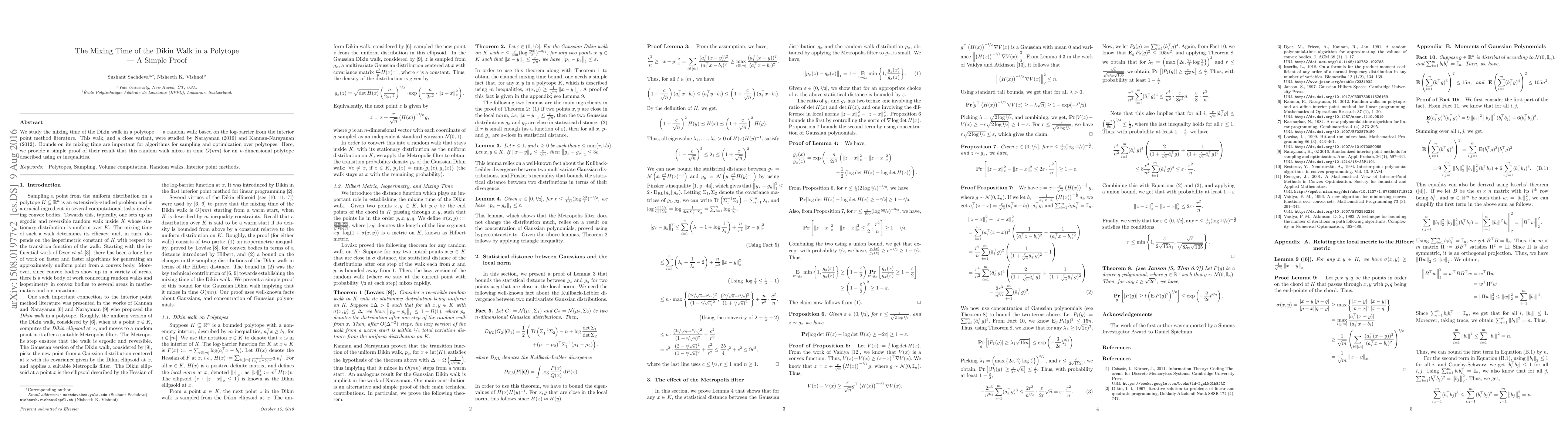 This paper presents a straightforward proof that the Dikin walk, a random walk in a polytope based on the log-barrier method, mixes in O(mn) time for an n-dimensional polytope defined by m inequalities. This result is crucial for algorithms that sample and optimize over polytopes.