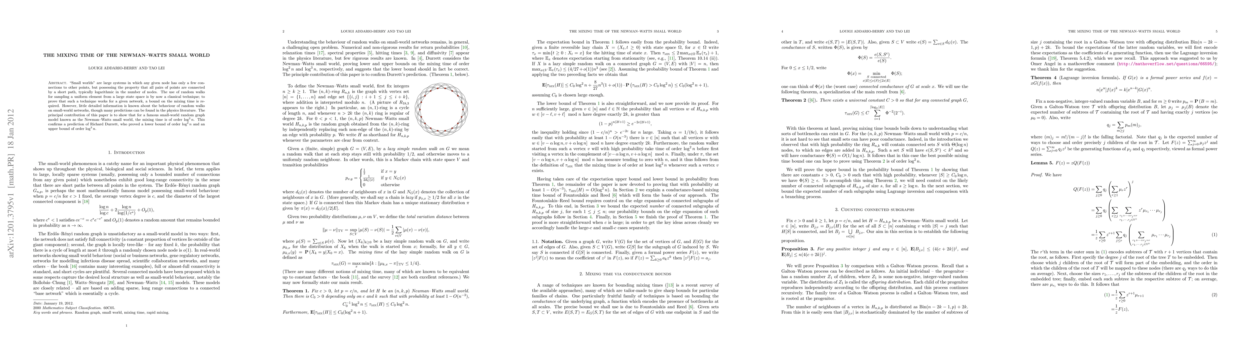 This paper investigates the mixing time of random walks on the Newman-Watts small-world network model, confirming that it is of order (log n)^2, thus validating Richard Durrett's earlier predictions of bounds for this mixing time.